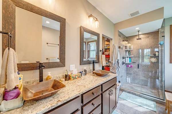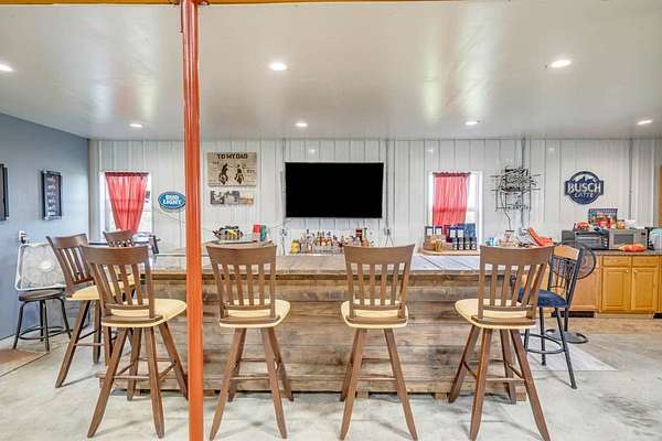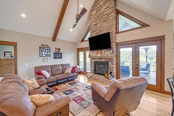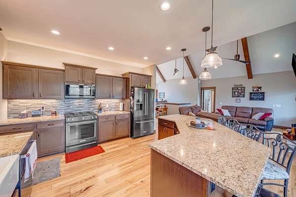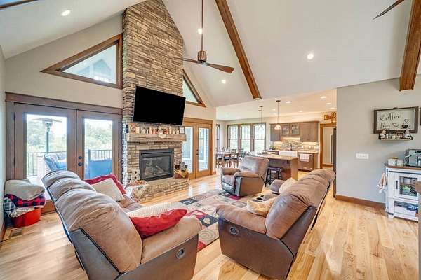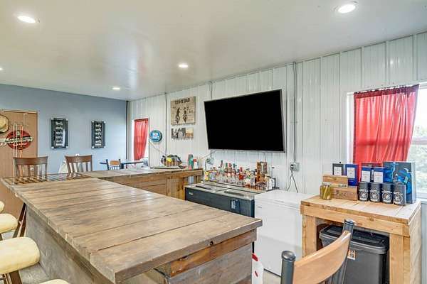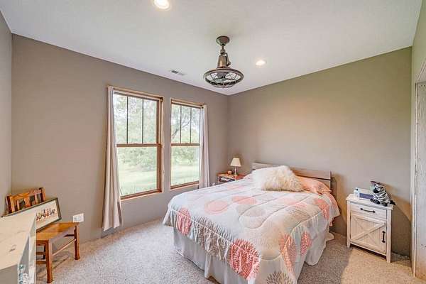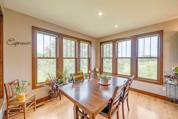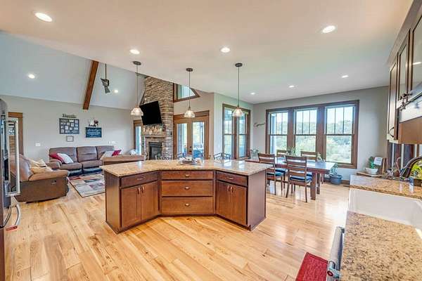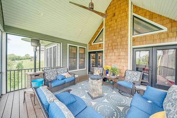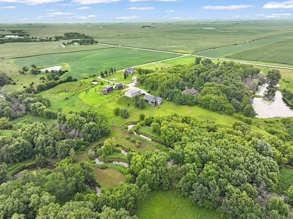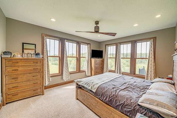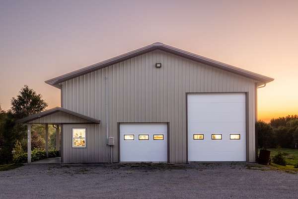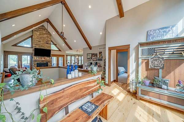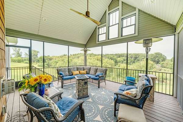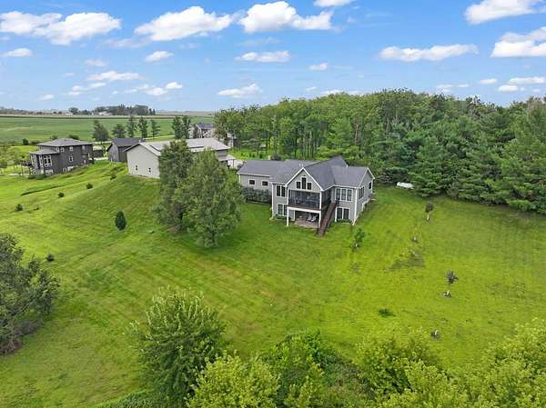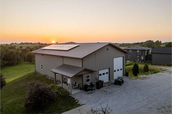 Welcome to your dream acreage just minutes from Nevada, offering just under 7 acres of peace, privacy, and endless possibilities. The show-stopping 40x64 outbuilding is a true multi-purpose haven with concrete floors, full insulation, heat, a complete bathroom and laundry, loft space, and a bar area perfect for entertaining, plus a massive 14' garage door for all your toys. Inside the home, the main level features an open-concept living space with soaring ceilings, a cozy gas fireplace, and a stunning kitchen and dining area that flow seamlessly to a 16x16 screened-in porch ideal for soaking in those breathtaking end-of-day sunsets. The spacious primary suite offers amazing views and a luxurious bathroom with dual sinks, a large tiled shower, and a soaking tub. A second main-level bedroom completes the upstairs. The finished walkout lower level offers a large family room, two conforming bedrooms plus a third non-conforming, a full bathroom, and generous storage. Lastly, enjoy low energy bills with added solar! This property blends comfort, function, and country charm, perfect for anyone looking to live, work, and play all in one beautiful place. All information obtained from seller and public records.