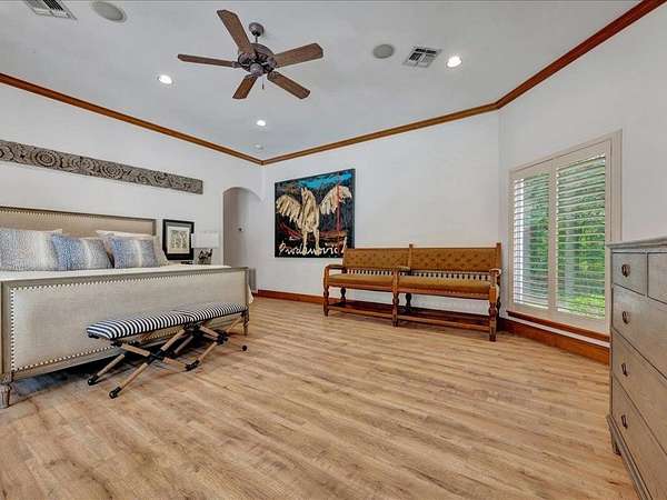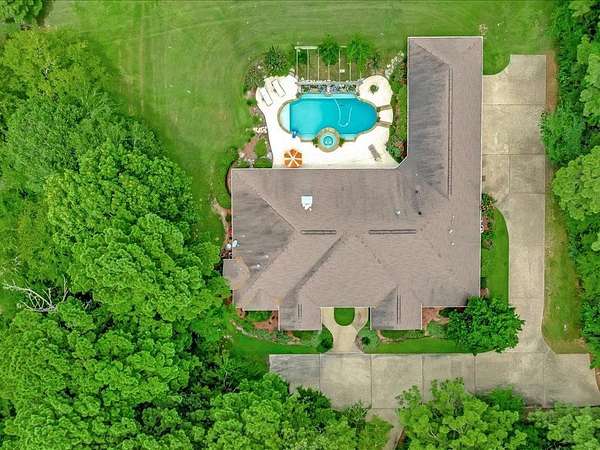 Immaculate, high-end custom home nestled on 3.56 beautifully manicured acres behind a private gated entrance on sought-after Brentwood Drive. Expansive living room with soaring ceilings, gas fireplace, stone mantle, and walls of windows offering stunning views of the pool and spa. Chef's kitchen features Viking appliances, large island, stone countertops, and arched formal dining room. Oversized primary suite with two walk-in closets, spa-like bath with jetted tub and walk-in shower. Two additional en suite bedrooms connected by a versatile family/game room. Dedicated office could serve as a fourth bedroom. Outdoor paradise includes pool, hot tub, outdoor kitchen, covered patio with fireplace and wood-accented ceiling. Enjoy peaceful views or cast a line in your own stocked pond, then sink a few putts on the backyard putting green. Triple garage and full security system. Perfect for entertaining and enjoying total privacy just minutes from Crown Colony country club.