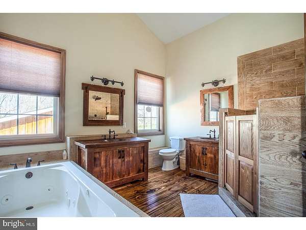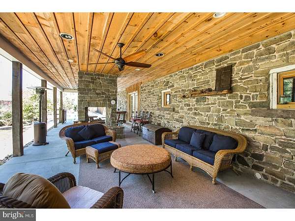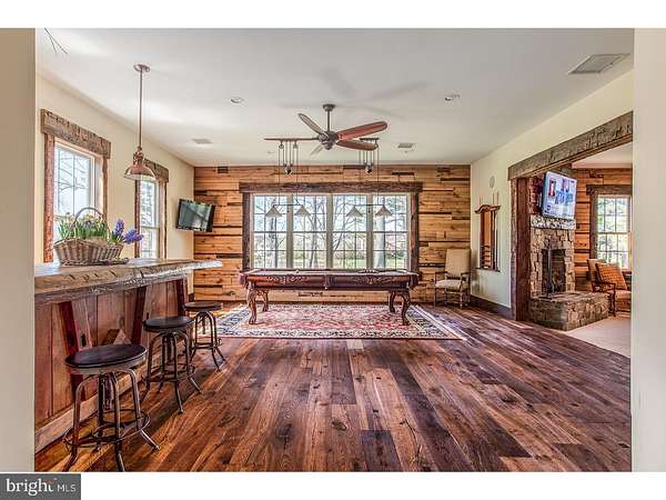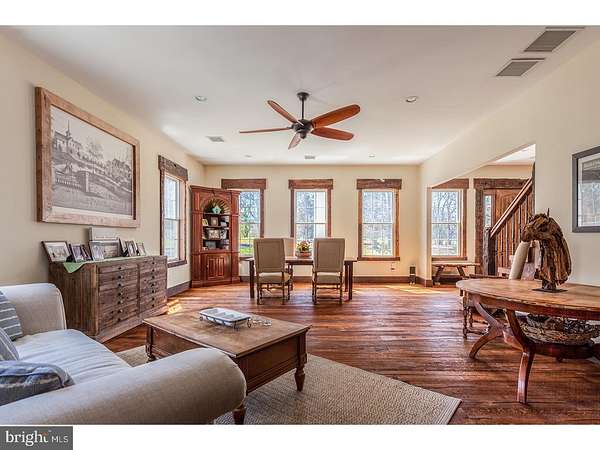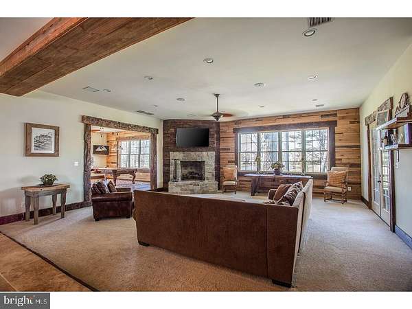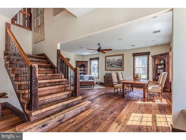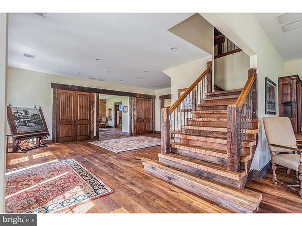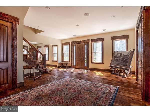 Set on over 12 acres of lush, park-like grounds and overlooking a serene pond, this extraordinary estate offers rare privacy and refined living. Backing to hundreds of protected, deed-restricted acres, the setting is both peaceful and picturesque. The main residence seamlessly blends old-world character with today's finest materials and modern conveniences. Original architectural elements have been thoughtfully repurposed throughout, honoring the home's history while enhancing its eco-conscious design. Much of the wood used in the interiors was reclaimed from the original homestead and is believed to pre-date Columbus, adding a sense of timeless authenticity to the space. The open and flexible floor plan is ideal for modern living, with hand-hewn wood details and radiant floor heating throughout the first level. The sun-drenched interiors are framed by expansive windows offering uninterrupted, private views of the surrounding landscape. At the heart of the home is a state-of-the-art chef's kitchen with top-of-the-line appliances, designed for both everyday cooking and elegant entertaining. The main house features six en suite bedrooms, indoor and outdoor fireplaces, a fully integrated smart home system, and a private home theatre. A charming columned front porch adds to the home's classic appeal. An attached wing offers its own separate kitchen, living/dining area, laundry room, three bedrooms, and two full baths-perfect for extended family, guests, or staff quarters, and can be closed off for privacy if desired. Additionally, a beautifully restored antique guest cottage offers further flexibility and charm. A separate barn-style building provides exceptional space for a car collection, gym, or large-scale storage, while a three-car garage is conveniently connected to the main house via a covered breezeway. The outdoor living spaces are equally impressive, featuring a covered terrace with an outdoor fireplace and multiple seating and dining areas. These overlook the beautifully designed heated saltwater pool. Ample parking and dual access from front and rear driveways make entertaining effortless. Located in desirable New Hope-Solebury, just 70 minutes to New York City, one hour to Philadelphia, and 35 minutes to Princeton.