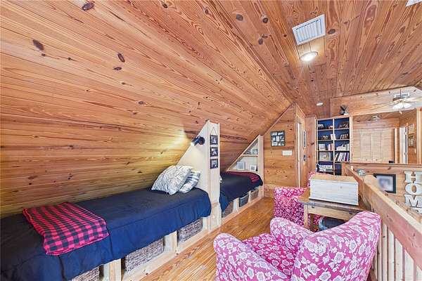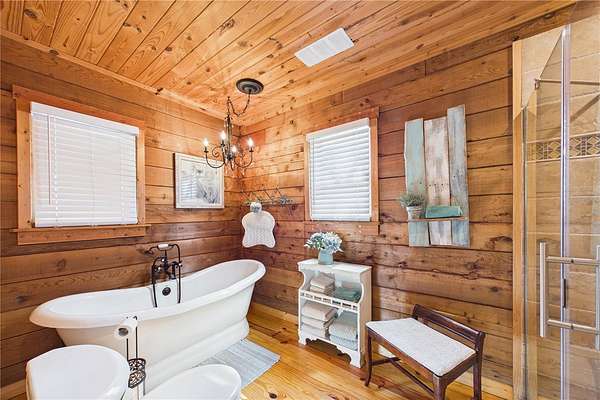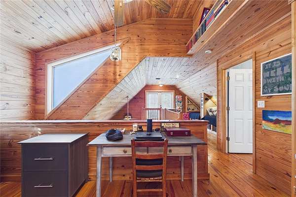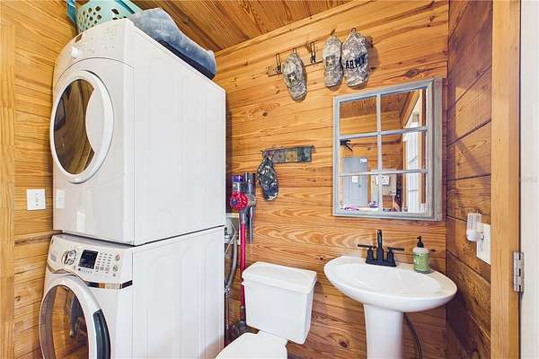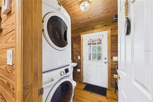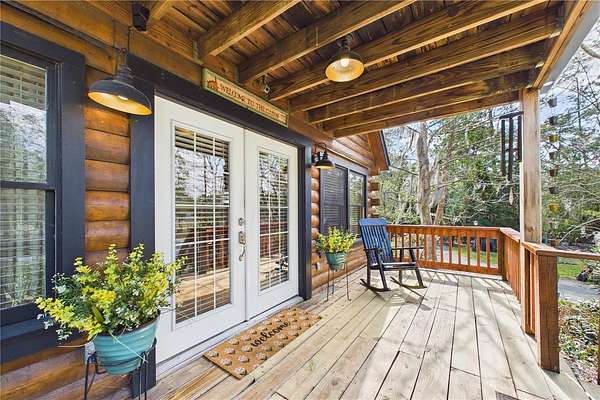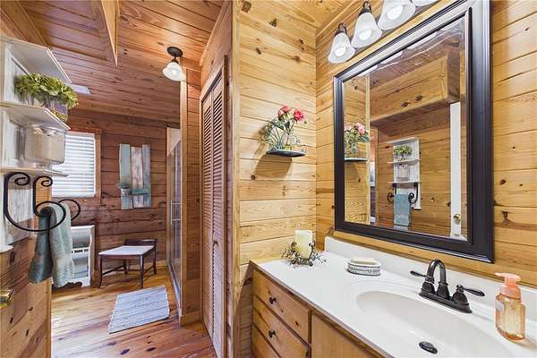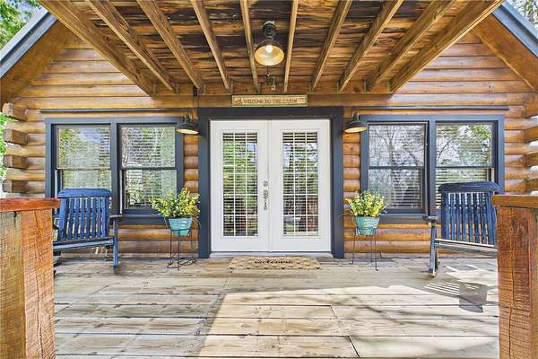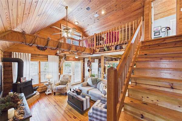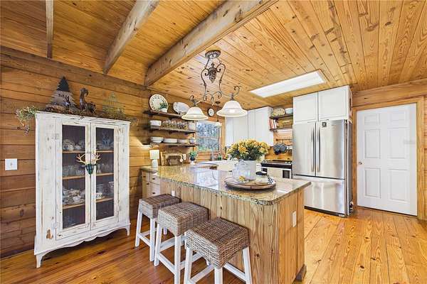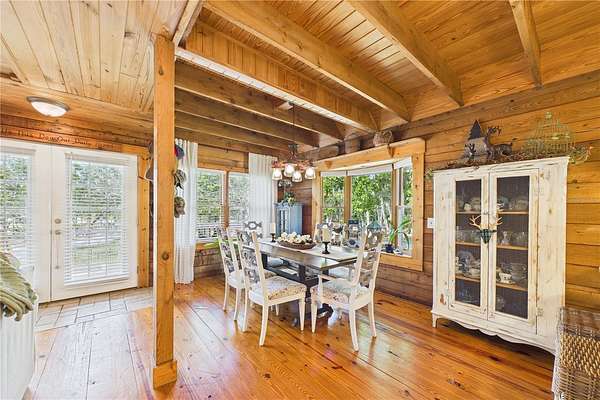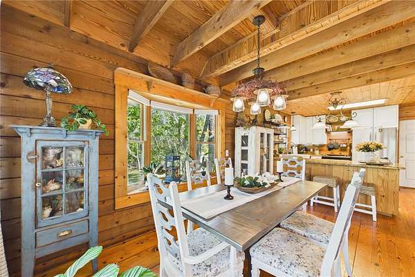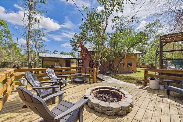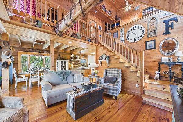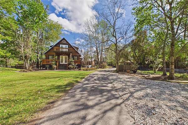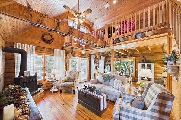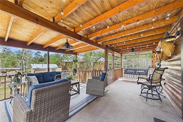 NO HOA and true country freedom define this nearly 2-acre log cabin estate on Reindeer Rd in Christmas, FL, where modern reliability meets rustic Southern charm just minutes from everyday conveniences. Tucked behind cleared grounds with wide open land stretching behind the home, this 2-story cabin offers over 1,500 square feet of warmth and character, with soaring ceilings, rich wood finishes, and a wood-burning fireplace that anchors the great room in cozy comfort. Natural light fills the space, and the layout blends charm with flexibility, featuring a loft with built-in bunk beds perfect for guests or family gatherings, an oversized converted walk-in closet space, and a downstairs bath with a classic clawfoot tub and a separate walk-in shower. Major improvements provide confidence and durability, including a new metal roof in 2021 on both the home and the separate 2-story barn, full exterior resealing in 2020, and an AC system manufactured in 2016 but installed new in 2021 and only in service for approximately five years. The front first-floor windows are being replaced with brand new high-impact windows, the home is elevated with ample crawl space, the well reaches 140 feet deep, the septic is regularly serviced, and termite treatment has been consistently maintained. Step outside to a massive raised wood deck with a built-in fire ring off the screened porch, a long private driveway with covered parking, and existing farm infrastructure, including goat and pig stables, a large chicken coop, fenced donkey enclosure with electric fencing, garden shed, and a 2-story barn ready to serve as workshop, storage, stables, or future conversion. The land behind the home opens wide, offering ideal space for horses or additional livestock, gardens, or simply enjoying the privacy of your own estate. This is the rare opportunity to enjoy the charm of log cabin living with the amenities and updates of modern ownership, all without restrictions, all on your own piece of Florida countryside.