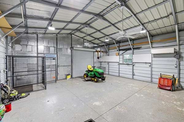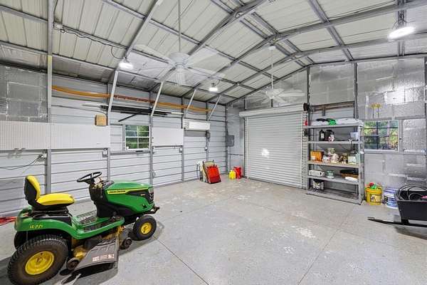 The gorgeous screened 2023 heated saltwater pool with design features like a large sunshelf and fountain, enjoys a spacious entertainment deck, tiki bar area, vibe lighting and a half bathroom. As if that wasn't enough already, this property also comes with a recently built detached shop with mini split air conditioning and two garage doors with openers, ideal for vehicles, hobbies, storage, or workspace. The land is fully fenced with cross fencing and multiple gates, making it functional for animals, equipment, etc.