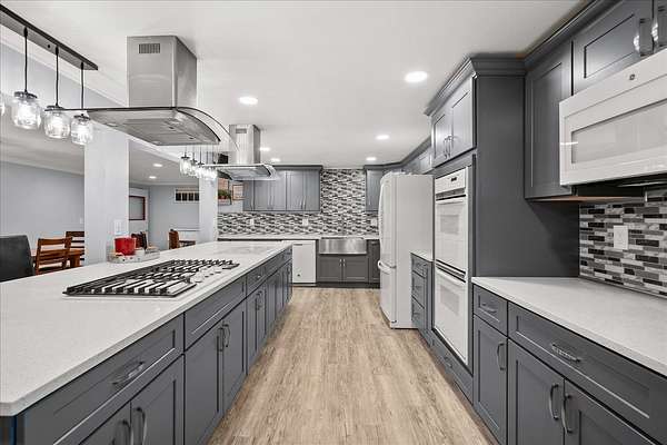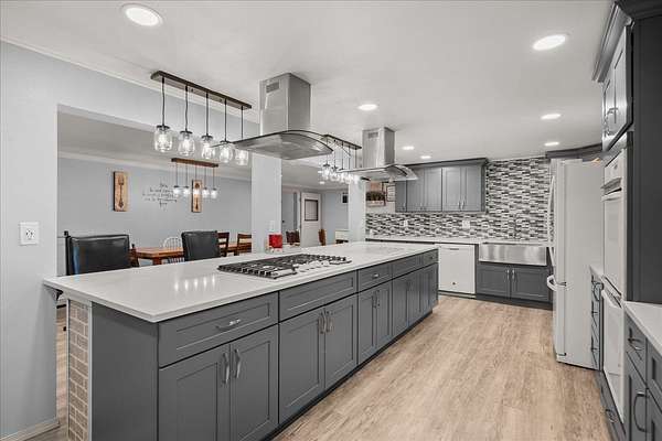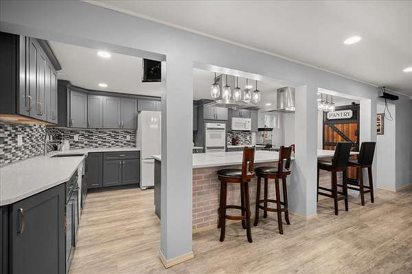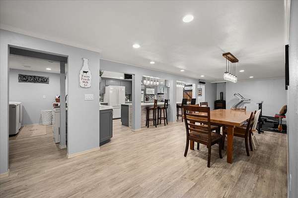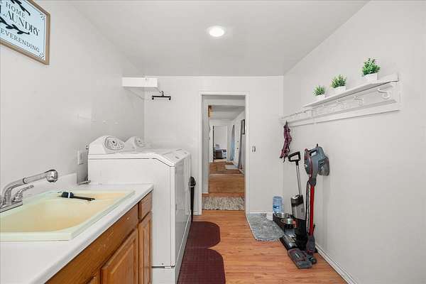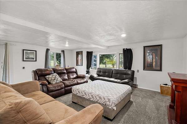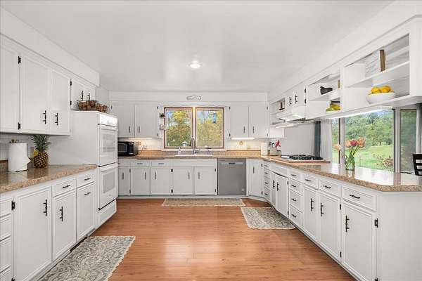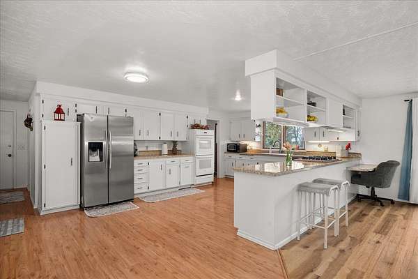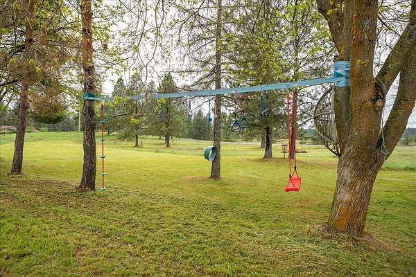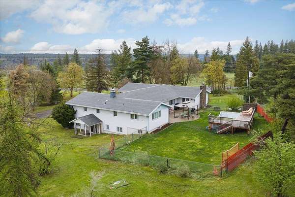 Experience the ultimate multi-generational compound on 5 picturesque acres, just 10 minutes from downtown Spokane. This massive 5,800+ sq. ft. daylight rancher features a true two-family setup with separate entrances and two independent laundry rooms. The main level offers breathtaking mountain views, a stone fireplace, a home office, and a primary suite. The lower level is a chef's dream, featuring a massive second kitchen with quartz counters, double ovens, and dual gas/electric cooktops. This floor includes four flexible non-conforming bedrooms and a newly tiled shower, perfect for extended family or guests. The grounds are a private playground with an 18-hole disc golf course, a 20x20 barn, and an above-ground pool with a custom deck. Hobbyists will love the attached garage with 9-foot doors and the rare 20x30 integrated indoor shop space for year-round projects. With fresh paint and immense volume, this estate offers unmatched versatility. Bring your vision to this sprawling Spokane legacy!