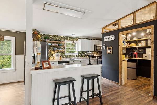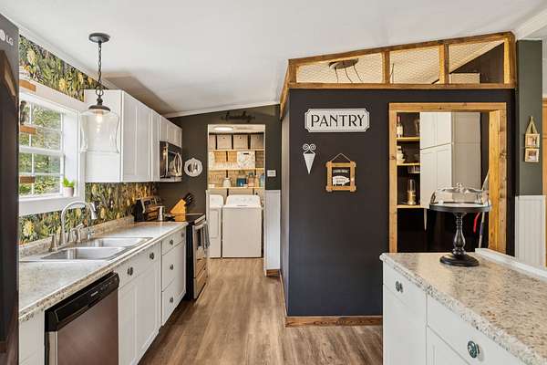 The kitchen is a dream--complete with stainless steel appliances, a large island, walk-in pantry, and a picturesque view from the sink. The spacious primary suite offers a walk-in closet and a beautifully updated en-suite bath. Two additional bedrooms are privately situated on the opposite side of the home - perfect for guests, a second suite, or even an efficiency apartment with its own entrance.