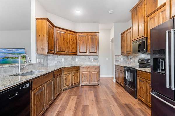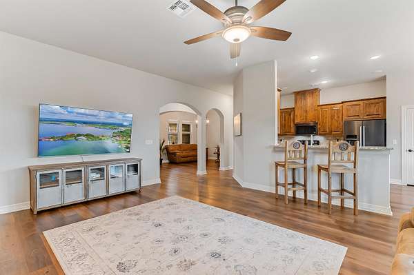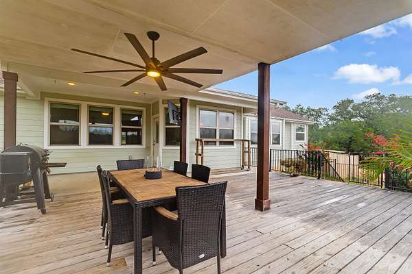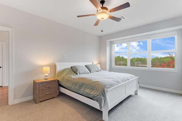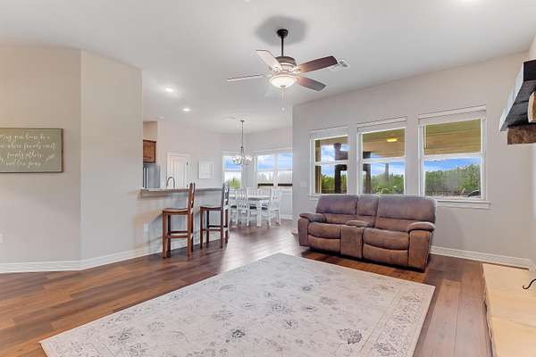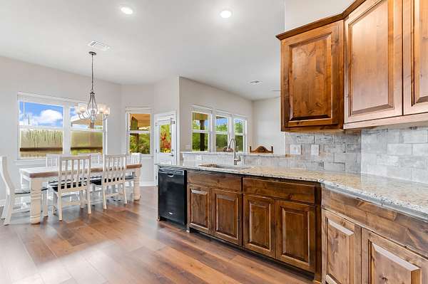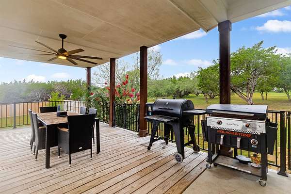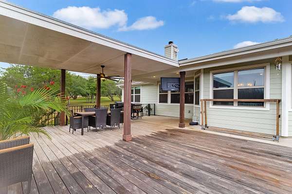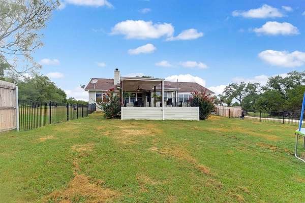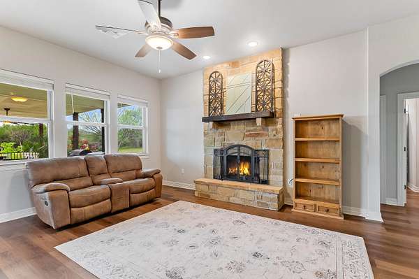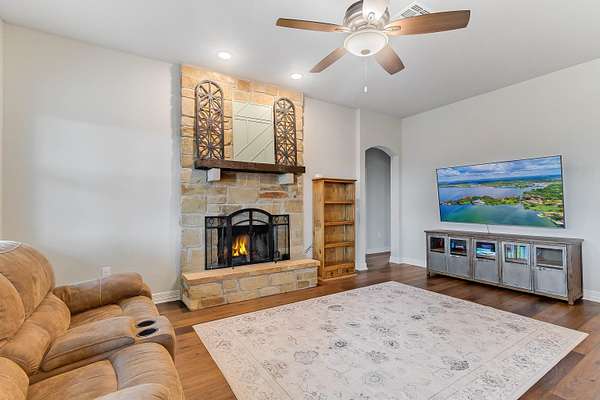 Welcome to 2109 Whitewater Drive - where peaceful Texas Hill Country views surround you in every direction. This home gives you the best of both worlds: quiet country living with city conveniences just 20 minutes away. It's tucked inside Whitewater Springs, a community that offers a neighborhood park, pool, hiking trails, and even a stocked fishing pond. Plus, with the Balcones Canyonlands National Wildlife Refuge wrapping around most of the neighborhood, you're truly one with nature. Built in 2019, this custom home has a spacious, open split bedroom layout with 4 bedrooms and 2 bathrooms. The kitchen is a standout, with granite countertops, beautiful custom cabinets, and plenty of room to cook and gather. In the living room, you'll find a cozy wood-burning fireplace with a floor-to-ceiling stone surround that really makes a statement. There's also a formal dining space that can double as a home office, playroom, or anything else you need. The primary bedroom is set apart from the others for extra privacy, and it's en-suite bath is complete with dual vanities and a large soaker tub. Out back, a large covered patio gives you the perfect spot to sip your morning coffee or host friends for a BBQ. Big windows throughout the home let in tons of natural and allow you to take in the hill country views from every room! There's even extra storage tucked under the massive back patio. This place is full of charm, you'll definitely want to check it out in person!