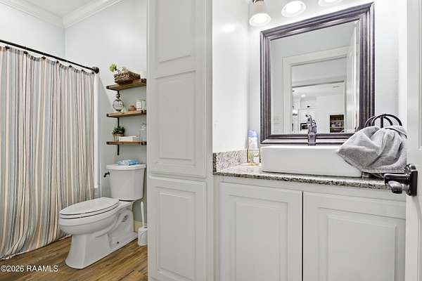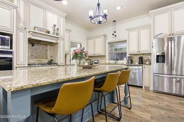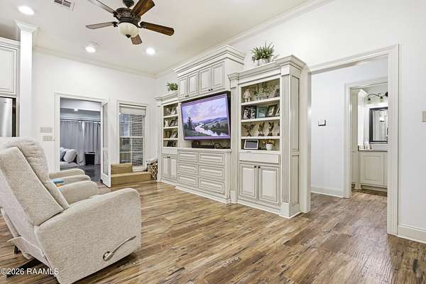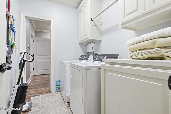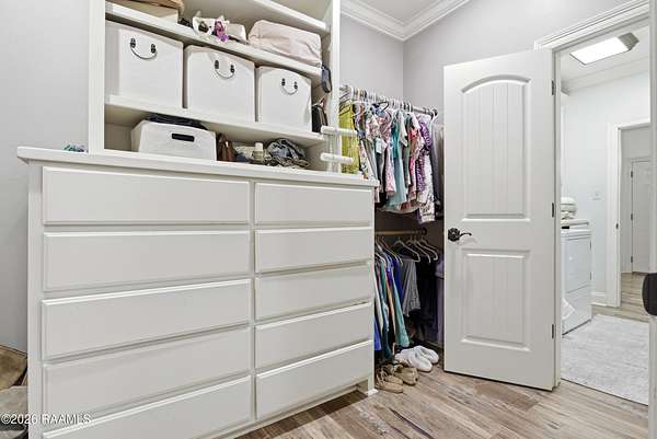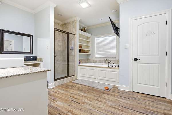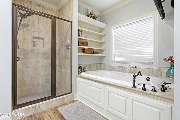 - Built-In Features, Built-Ins, Crown Molding, Electric Dryer Con, Electric Washer Con, Granite Counters, Separate Shower, Varied Ceiling Heights, Walk-In Closet(s)