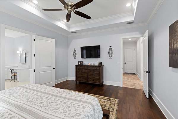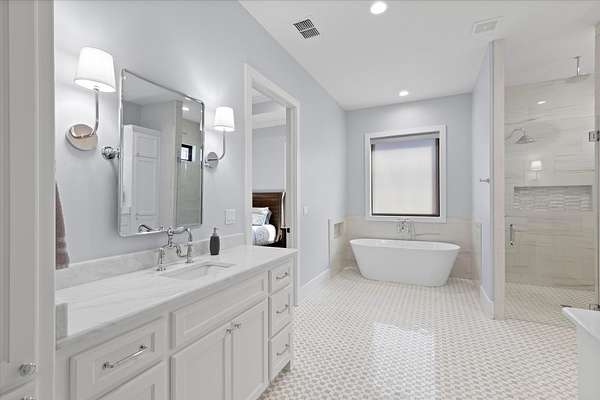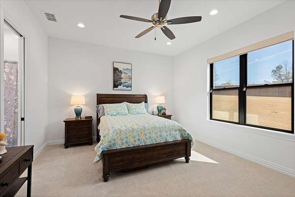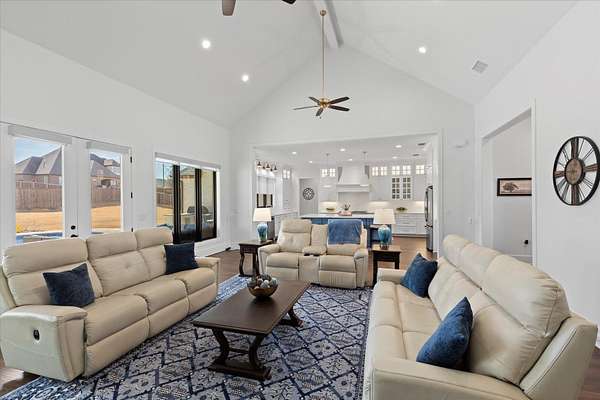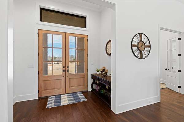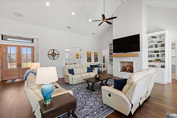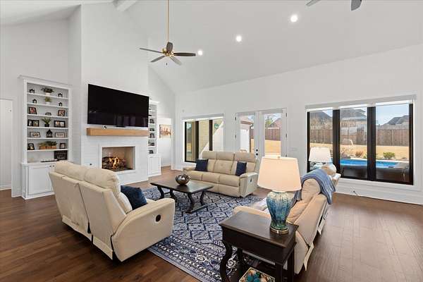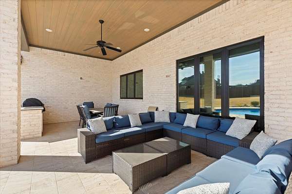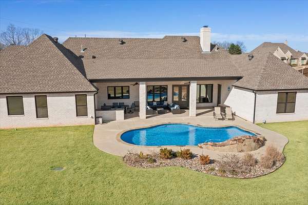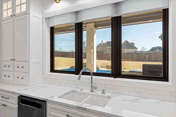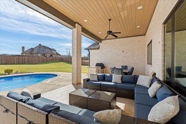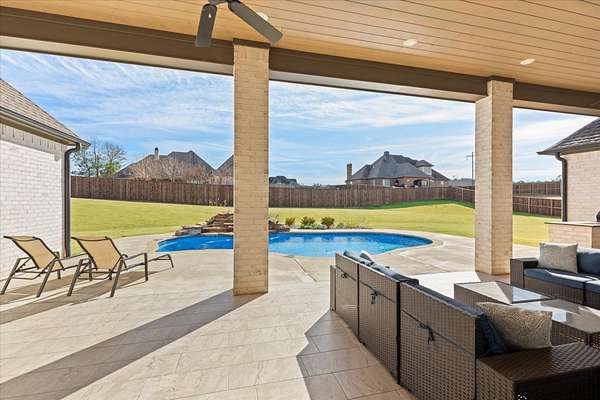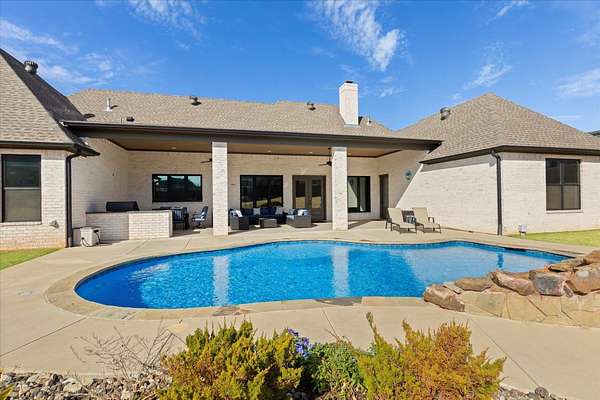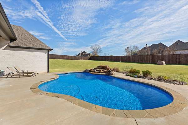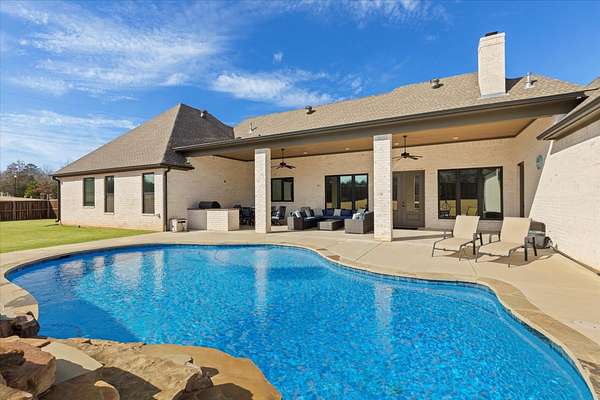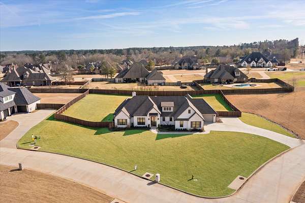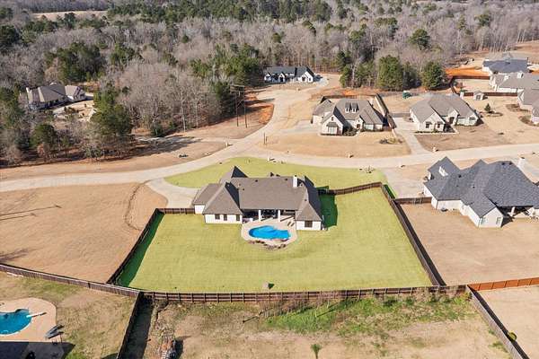 Stunning 2022 Newland Properties home with designer finishes curated by WG Interiors, set on a private 1.5-acre corner lot with a resort-style pool in the gated Hillcrest Trails community in Hallsville ISD. SIGNIFICANT SAVINGS OVER NEW CONSTRUCTION - SELLER HAS SPENT $171,000 IN UPGRADES for the pool, outdoor kitchen/ tiled patio, well, generator, wooden privacy fence, window tinting, interior shades, and creek bed. This 3,278 square-foot open-concept residence features a chef's kitchen with quartz countertops, an expansive island, a gas range, and a wet bar, ideal for entertaining, along with an impressive walk-in pantry. Hardwood floors in the living areas and primary suite, elevated lighting, and custom shades throughout create a refined yet inviting atmosphere, while a versatile additional room--currently used as a dining space--offers flexibility as a formal dining room, home office, or second living area. The serene primary suite includes a spa-like bath and a generous walk-in closet, complemented by thoughtfully designed secondary bedrooms and bathrooms. The beautifully landscaped yard is irrigated with a deep water well and all windows are tinted resulting in significant savings on utilities. Additional highlights include a whole-home generator, two tankless gas water heaters, a three-car garage, and an expansive covered patio, completing this exceptional luxury retreat.