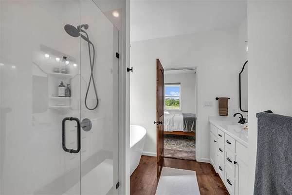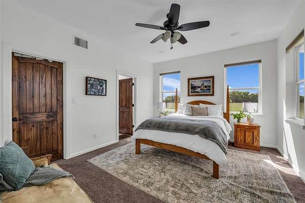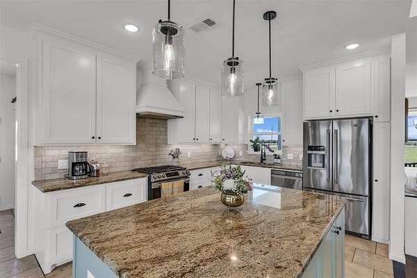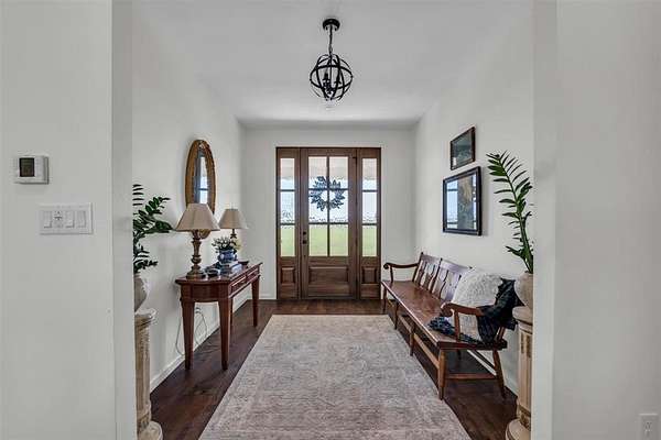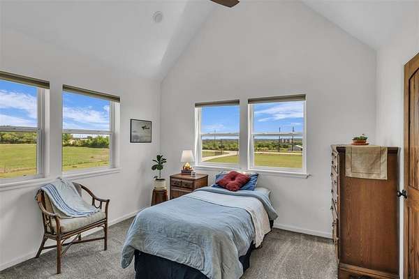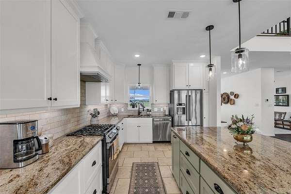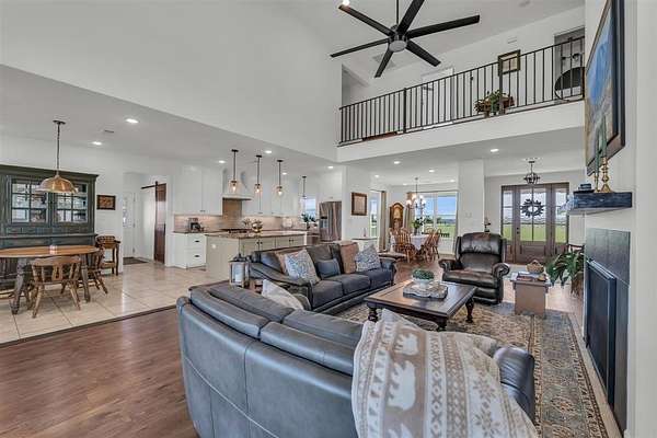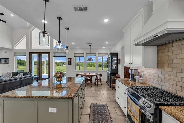 Inside, a light-filled foyer opens to beautiful vinyl plank flooring and an open, airy layout. The spacious living room features soaring vaulted ceilings, creating a warm and inviting space. At the center of the home, the thoughtfully designed kitchen boasts a large island, granite countertops, travertine floors and backsplash, a generous dining area, and a walk-in pantry complete with extra prep space. The private primary suite is a true retreat, featuring a spa-like bathroom with double vanities, a soaking tub, separate shower, and abundant storage. Upstairs, two additional bedrooms and a versatile bonus room provide endless possibilities--whether you need a playroom, guest suite, or second living area. Step outside to the covered back porch and take in sweeping pasture views and unforgettable Texas sunsets. Out front, young peach trees are growing adding to the property's country appeal. With peaceful surroundings and refined interior finishes, this home offers the best of rural living without sacrificing style or comfort. This is one you won't want to miss!