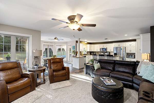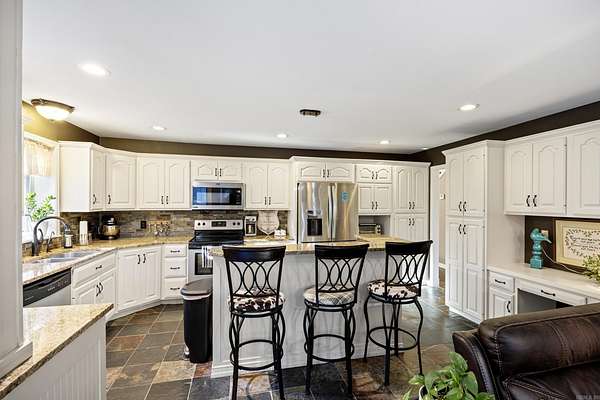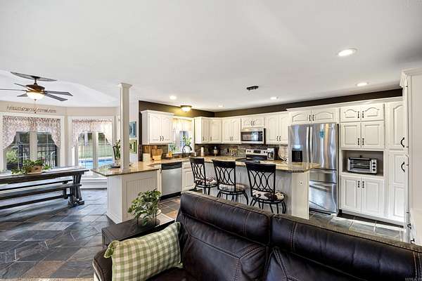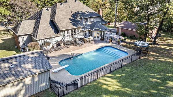 4 BEDROOMS o DETACHED SHOP o IN-GROUND POOL -- CLIFF & STREAM Located in one of Russellville's most desirable neighborhoods within the Pottsville School District, this immaculately maintained 4-bedroom, 3.5-bath home offers over 3,100 sq. ft. of refined living and quality craftsmanship around every corner. The main living room features floor-to-ceiling windows that fill the space with natural light and create a grand, welcoming feel. The hearth room with built-ins offers a cozy retreat connected to the kitchen and breakfast nook, where a kitchen window overlooks the sparkling pool. The kitchen includes granite countertops and timeless finishes. Step outside to your private paradise with an in-ground pool, pool house with kitchenette and bath, and a detached shop perfect for hobbies or a man cave. With tons of storage throughout this home, a attached three-car garage, and move-in ready perfection, this home delivers elegance, comfort, and location all in one.