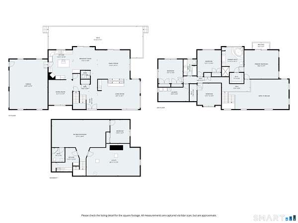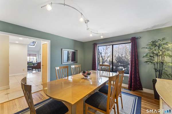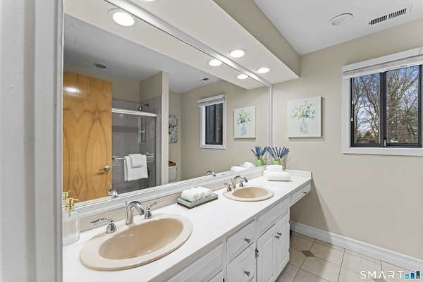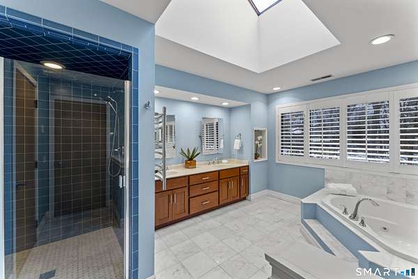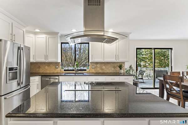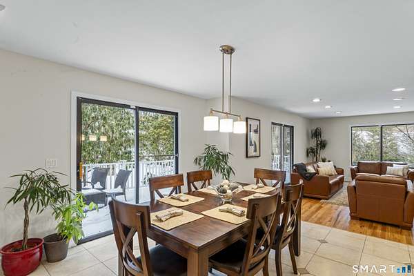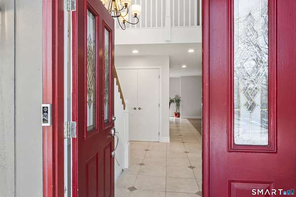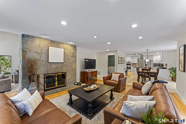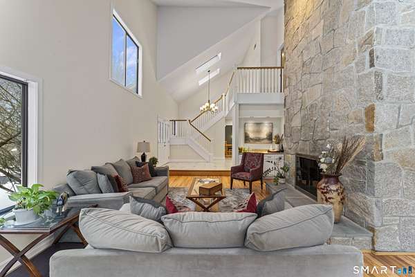 Drive up the circular driveway and discover this spacious, desirable contemporary home bursting with curb appeal, beautifully set on a level, private acre. Light pours through skylights and walls of glass, creating a bright and airy atmosphere throughout. A welcoming entry opens to a stunning two-story living room highlighted by a dramatic stone fireplace and wet bar - perfect for entertaining. The open, flowing layout continues into the inviting family room, featuring a second stone fireplace, and an updated kitchen that connects seamlessly for easy gatherings and everyday living. A generous dining room is perfect for hosting memorable celebrations. Upstairs, you'll find four spacious bedrooms, including a serene primary suite with sliders to a private deck - your own peaceful retreat. The laundry room is conveniently located upstairs. The finished lower level expands the living space with a fantastic recreation room with a screen projector and speakers for movie night, a full bath, and a versatile bonus room ideal for guests, a home office, or workout space. An oversized two-car garage completes this exceptional home that blends comfort, style, abundant natural light, and exceptional entertaining spaces.