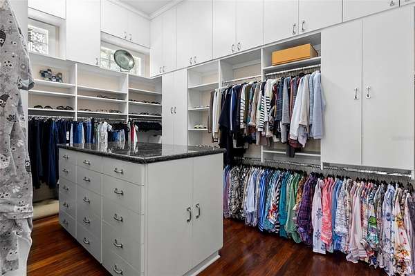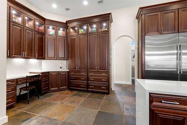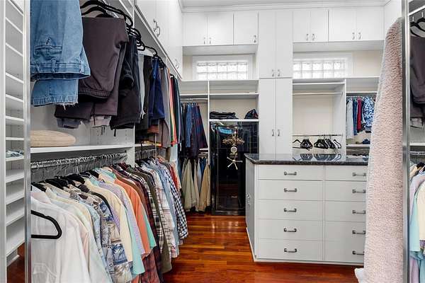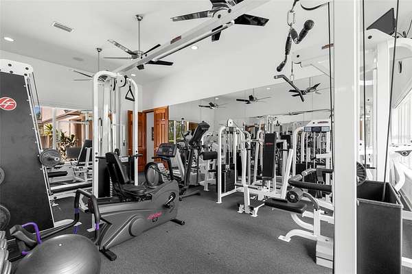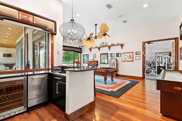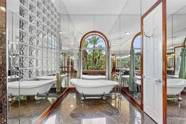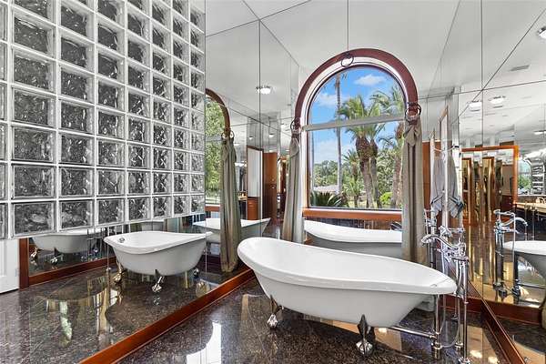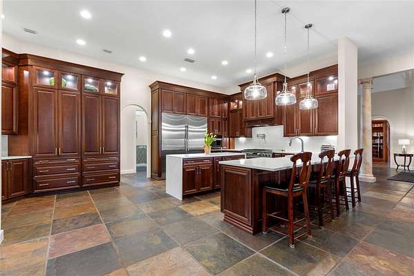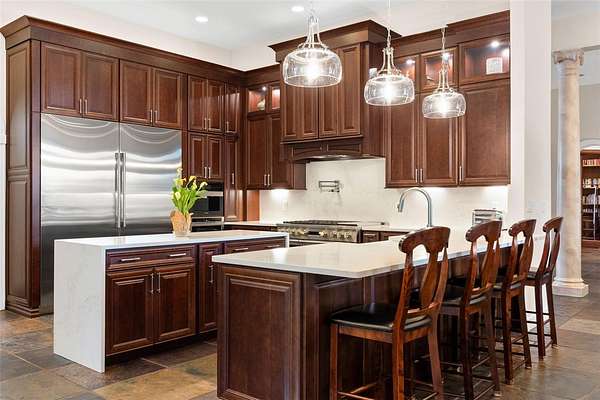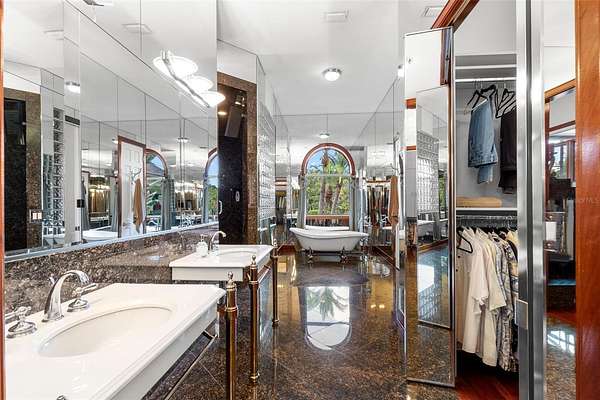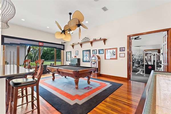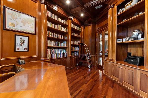 This perfectly appointed home features 5 ensuite bedrooms, including a main-floor primary retreat; 6 full & 3 half baths + a 4-car garage w/ private gated entry. The grand foyer leads to multiple formal entertaining spaces: dining room, formal living & a home office/library w/ floor-to-ceiling bookshelves, custom built-ins & coffered ceilings. Entertainment & leisure spaces include a game room w/wet bar, wine cooler, beverage center & ice maker; in-home fitness center complete w/all equipment; fully outfitted home theater/media room w/dry bar, microwave & beverage center; loft & screened balconies w/spiral staircase extending your outdoor living. The chef's kitchen showcases stacked solid wood cabinetry w/custom pullouts, glass door accents, under-cabinet lighting, beautiful Quartz countertops w/ waterfall island edge, large single bowl apron sink, stainless steel Monogram appliances, gas range w/griddle & custom hood, double-drawer integrated dishwashers, built-in Miele espresso machine, dedicated desk area & a spacious breakfast nook. The primary suite offers a sitting area, granite fireplace, dual custom walk-in closets, mirrored dressing area, steam shower, dual vanities & a stunning footed tub. Notable finishes include Raja slate, mahogany & marble flooring, custom millwork, inverted tray ceilings, designer lighting, surround sound ceiling speakers throughout, double washer/dryers, dog wash station & more! Recent updates include: upstairs AC(2025), downstairs ACs('20/'17), water heaters('22/'24), several new windows(2025), pool equipment(2025), landscape lighting(2024), exterior paint(2024), lifetime aluminum roof & whole-house automatic Generac generator(2025).