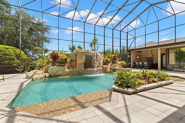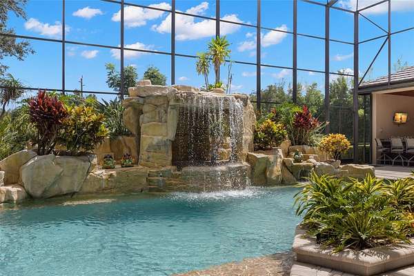 Outdoors, enjoy a private tropical oasis w/resort-style pool & spa, impressive grotto waterfall feature, sun shelves, PebbleTec surface, saltwater chlorination, solar heating, LED lighting & paver decking. The expansive screened lanai features tongue-and-groove ceilings, outdoor kitchen/bar w/granite countertops, beverage center, gas grill & stainless hood, misting fans & a full pool bath w/ample storage. The sprawling backyard is beautifully landscaped, fenced, w/mature trees & stunning landscape lighting.