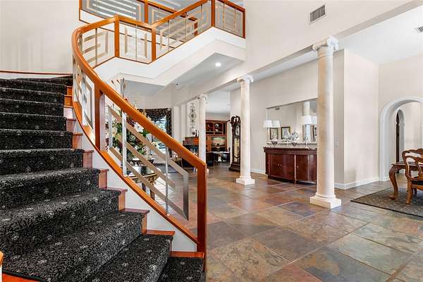 Welcome to a one-of-a-kind retreat nestled in the prestigious gated subdivision Chateaux des Lacs, an elegant enclave where privacy, grandeur & impeccable craftsmanship unite. This spectacular residence spans nearly 8,000 sqft of living space & sits up on a 1.65-acre lot, offering room to roam, entertain & indulge.