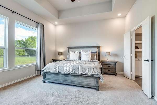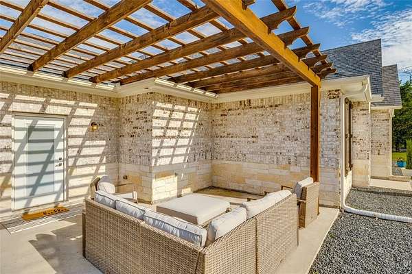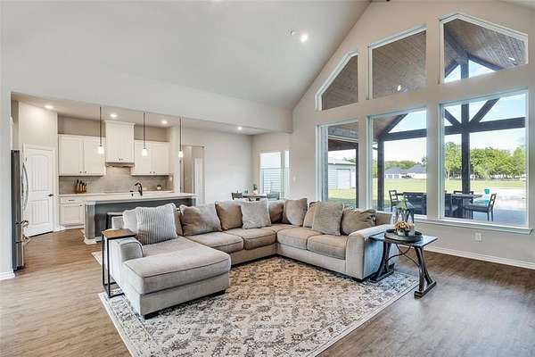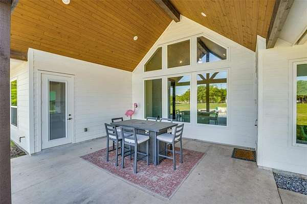 Set on two acres under the bright country sky of beautiful Lucas, this sprawling single-story home boasts a brilliance of design with its open spaces and orientation of windows which invite into the home, the tranquility of the backyard oasis. The defining signature of the plan is discovered as soon as you walk in, a towering, beamed A-framed ceiling captures your attention and immediately draws your attention to the covered outdoor living space, the pool, and well beyond to the fenceline of the acreage. The kitchen and living room are the combined spaces where it all happens! Gorgeous floor-to-ceiling stone wall with decorative fireplace with the perfect inset for media and a kitchen with a huge island, lots of cabinets, built-in appliances and a separate breakfast area with window views to the backyard. The master bedroom is split for privacy and enjoys direct access to the backyard, views to the backyard, and it is noted by its richly appointed ensuite with double vanity, garden tub, walk-in closet, and a huge triple-sized shower. The secondary bedrooms share a second bathroom with high-end shower design. Just past the kitchen you'll find a half-bathroom with easy access to the backyard. The media room is perfect space to enjoy but versatile to be used to your heart's desire. The laundry room is next to the mud room which exits to the front. 60x24 ft storage building with two garage doors, electric gate access to the back and parking. The unique 350 SF of outdoor living space out front is ideal for morning coffee or the wonderful sunsets. 650+ SF of backyard patio space not counting the pool decking. If you want the stars of the country sky but the close proximity of the city conveniences, a perfect backyard to entertain and swim, and a single-story floorplan, large enough to enjoy, but not too large to have to downsize later, this is the one.
