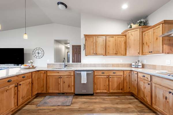 - Breakfast Bar, Enclosed Toilet(s), Granite Counters, In-Law Floorplan, Linen Closet, Open Floorplan, Pantry, Primary Downstairs, Shower/Tub Combo, Soaking Tub, Stone Counters, Tile Shower, Vaulted Ceiling(s), Walk-In Closet(s), Wired For Data