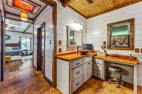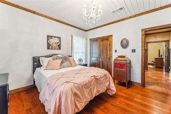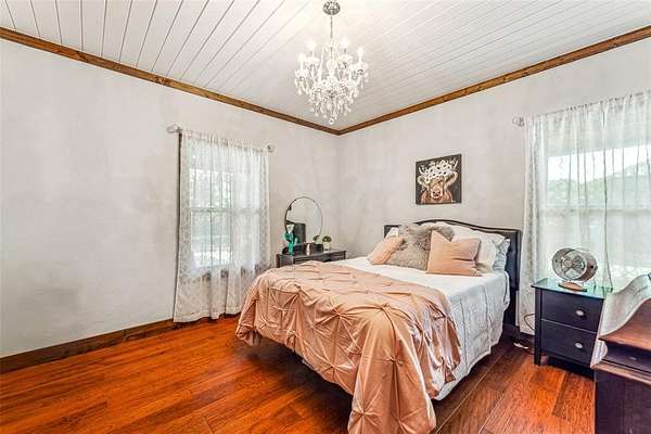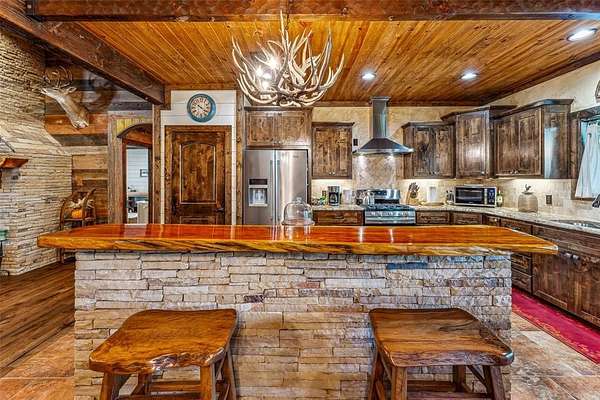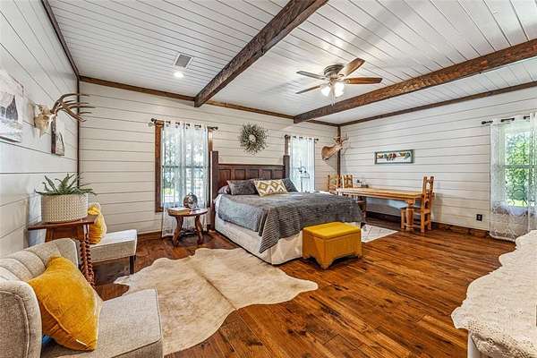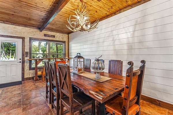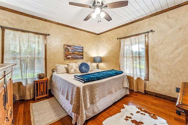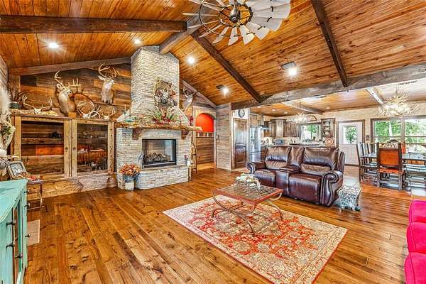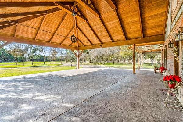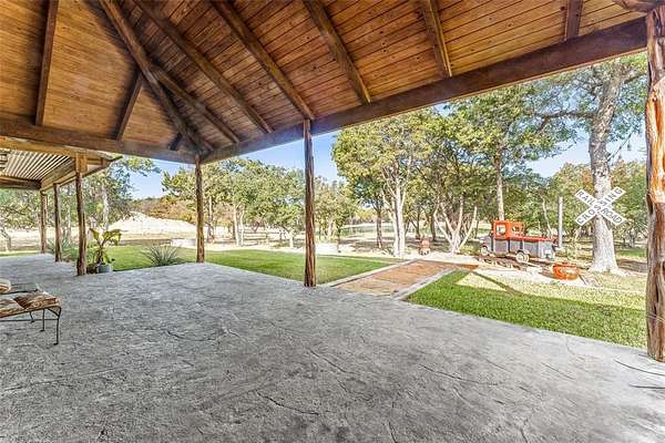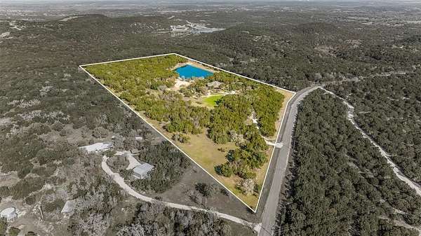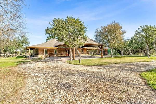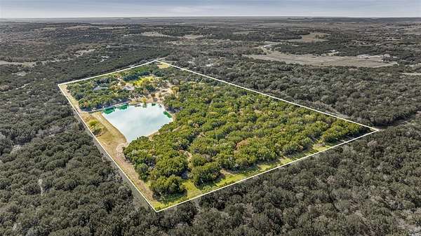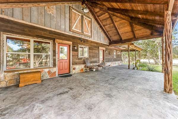 Beautiful custom home with private lake on 20 secluded acres that could also be repurposed as a short-term vacation rental or a special events venue. Property has dense tree cover that provides excellent wildlife habitat and is bordered on 2 sides by large, undeveloped ranches. The 1-acre lake has 20 ft depth and is stocked with multiple species of bait fish, plus crappie, black bass, and channel cat. All 4 sides of the property are cleared at the boundaries, and perimeter fencing exists on 3 sides. The 2,166 sqft home has an impressive 30x35 covered parking area at the entrance, as well as covered porches with lighting on the remaining 3 sides, all of which feature stamped, stained concrete. These porches create a dramatic outdoor living space with views of the beautifully landscaped yard with St. Augustine grass and walkway to the lake.