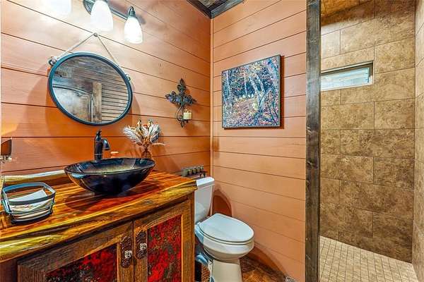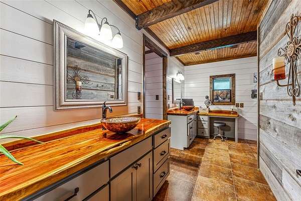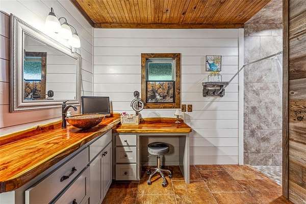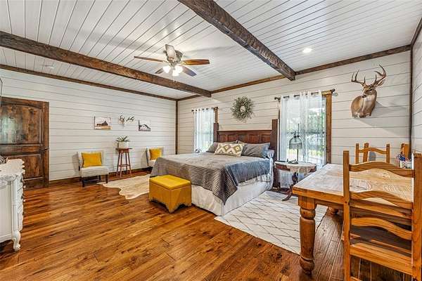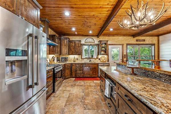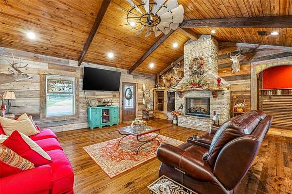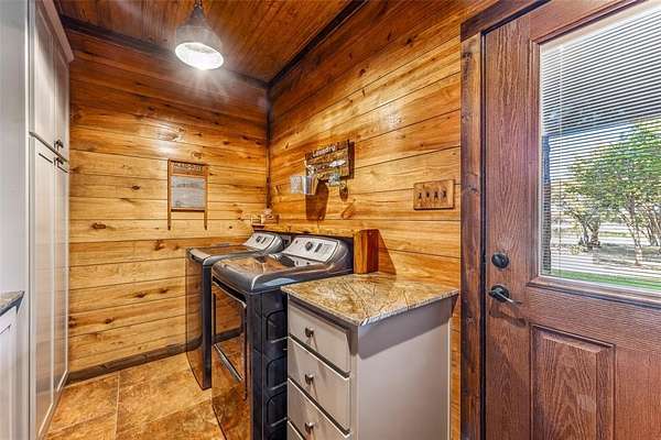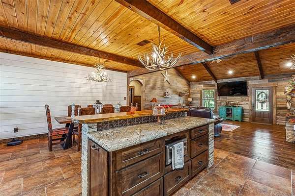 The home's entryway leads into a spacious living area with vaulted wood ceilings with exposed beams and a stacked-stone WB fireplace with insert. The open concept design also features a roomy kitchen and dining space with large windows overlooking the backyard and lake. The kitchen has granite countertops, propane oven-stove, and stainless appliances. It also has a large island with electricity, a granite prep space, and a custom cedar countertop on the dining space. The primary bedroom and bath have exposed wooden beams, wood floors, his-her walk-in closets, separate vanities with cedar countertops, and a large, tile shower. The home also incorporates energy efficient features such as Low-E windows and open cell foam insulation. Outbuildings include storage space with a roll-up door and room for parking, and it also houses the well water storage tank.