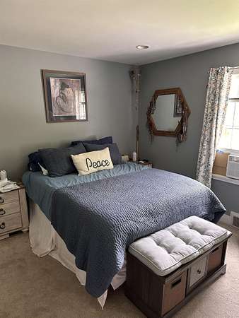 Nestled on hill on a secluded road, this cape with 3 bedrooms, two baths overlooks a pond on the property. The almost four acres contains not only a pond, fruit trees, a babbling stream, fenced in area for pets and covered porch to sit and enjoy the view. The house is impeccable, three bedrooms, two up and one down, two baths, hardwood floors with carpeting in the bedrooms. The basement has two means of entrance and is partially finished, this could be finished for more living space.
