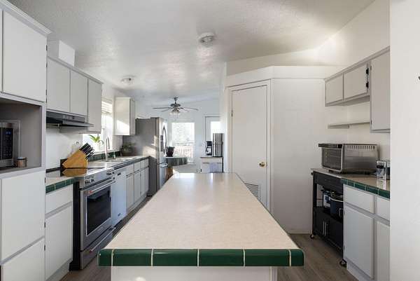 - Double Vanity, Fiberglass Stall Shower, Kitchen Island, Laminate Counters, Linen Closet, Pantry