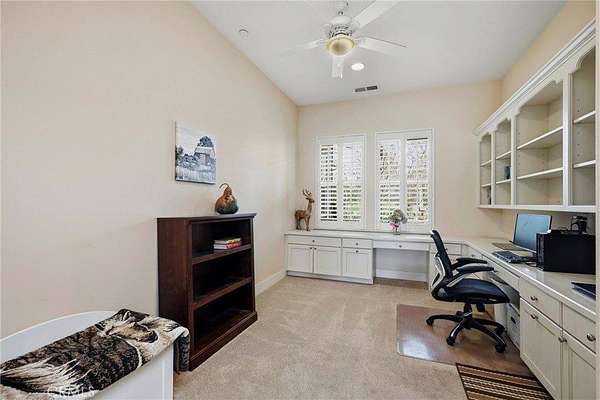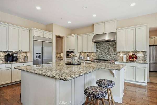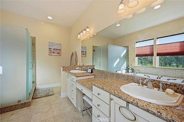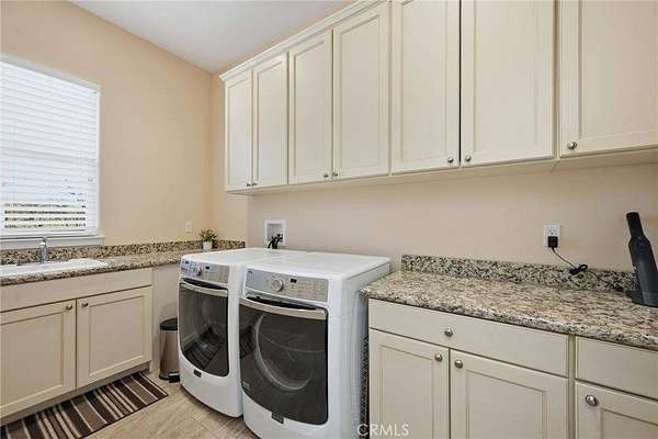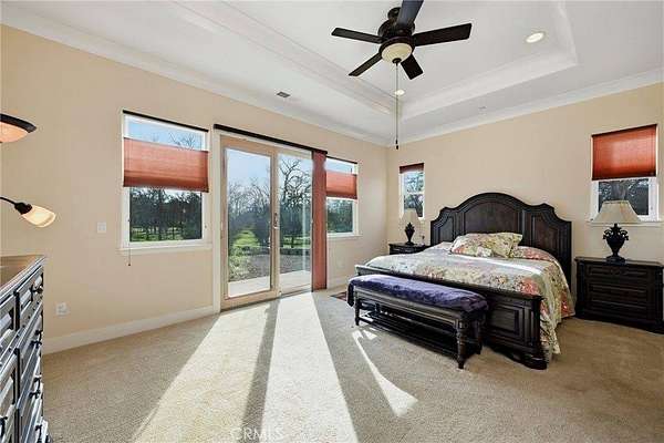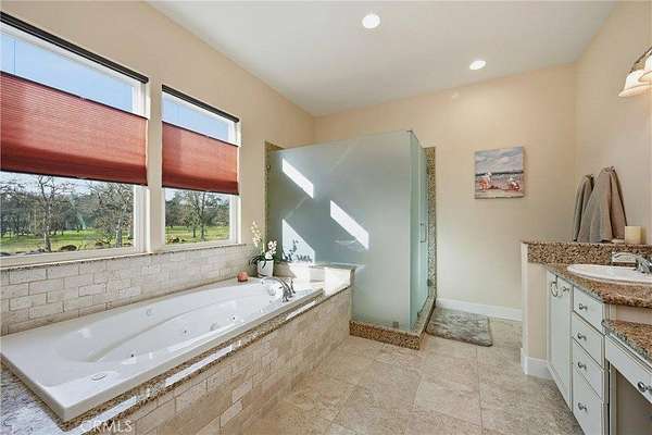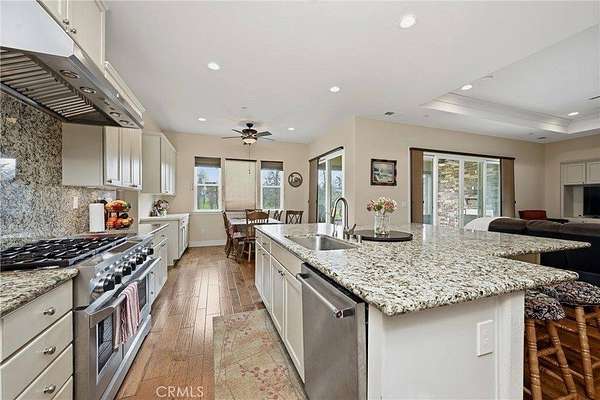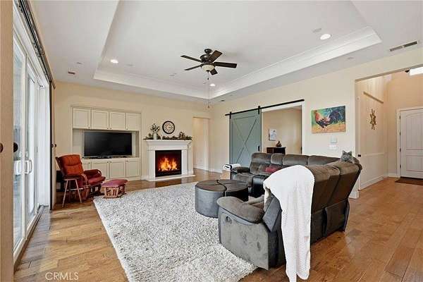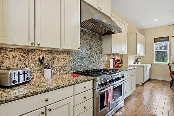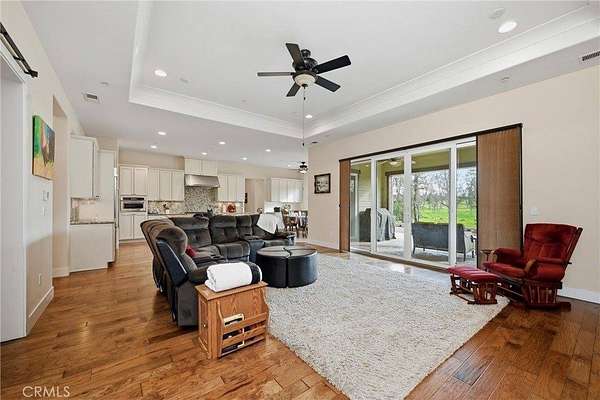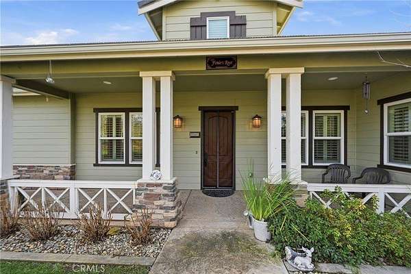 Like living in a park! This thoughtfully appointed Contemporary Craftsman on nearly 5 acres offers space, comfort, and exceptional functionality. Since it's said that the kitchen is the heart of the home, consider this a home with a huge heart. This expansive kitchen features an oversized island with bar seating, sunny breakfast nook, abundant cabinetry, and matching stainless steel KitchenAid appliances, including a 6-burner gas range and double oven. A coffee bar, large pantry, mudroom with extra fridge, and laundry room with utility sink complete this efficient hub. The kitchen flows into a spacious family room with a cozy gas fireplace, rich engineered hardwood floors, tray ceilings, and 12-foot or higher ceilings throughout the house. A private office with rolling barn door and a formal dining room with built-ins offer flexible living options. Get creative with how you choose to use them! Just off the family room, the covered patio “California room” overlooks the oak-studded, pasture-like grounds, inviting outdoor gatherings with its wood-burning fireplace and serene views. The bedroom wing includes a primary suite with outdoor access, two walk-in closets, jetted tub, walk-in shower, dual sinks, vanity, and private water closet. A junior suite, with its own full bath and walk in closet and two additional bedrooms, full bath, and powder room complete the layout. Outside, the space is just as thoughtful and spacious as it is inside. Enjoy peace of mind with no HOA fees, a 50-year tile roof, an RV pad with full hookups, a circular drive, and six garage spaces—an attached 2-car plus two detached 2-car garages (one with workshop and half bath). A well with filtration and treatment systems supplies the property with all its water needs. Fully fenced and cross-fenced with programmable sprinkler irrigation and a keypad-controlled security gate. One can easily imagine adding ranch animals or a pool to this level, open space (maybe both!) This peaceful, park-like setting is sure to be the backdrop for many happy memories to come.