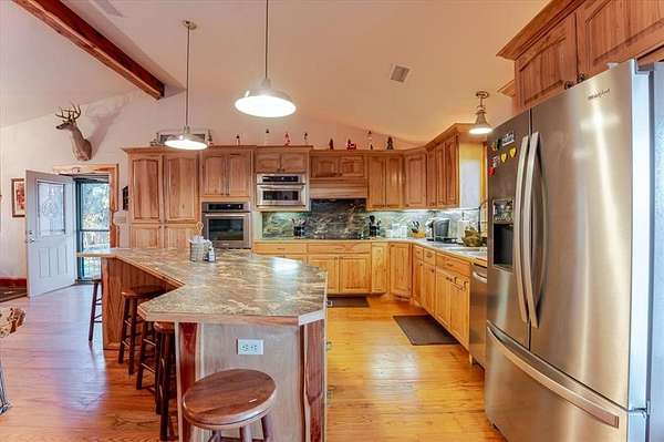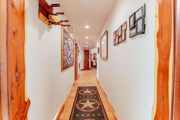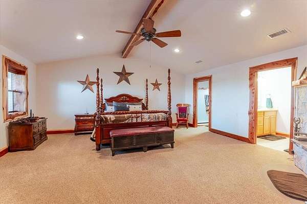 Look at this Stunning Barndominium on Beautiful Acreage with Prime Hunting & Fishing. Experience the perfect blend of comfort, functionality, and country living in this impressive 3-bedroom, 2-bath barndominium with dedicated office space, offering 2,500 sq ft of living area plus an additional 2,500 sq ft garage or workshop with full bathroom and concrete safe room. Thoughtfully designed with an open-concept layout, this home features cedar trim throughout, adding warmth and rustic charm. The spacious living room showcases a cozy fireplace, which is also shared with the primary bedroom, creating a relaxing retreat. The large kitchen is ideal for gathering, complete with a generous island, ample workspace, and seamless flow into the main living area is perfect for entertaining and everyday living. Step outside to enjoy the expansive porch with covered awning, where the back door overlooks a picturesque pond and rolling acreage, offering peaceful views and unforgettable sunsets. In addition to the main garage, the property includes a 1,500 sq ft insulated garage barn with electricity, providing excellent space for equipment, hobbies, or storage. Outdoor enthusiasts will appreciate the prime hunting and fishing opportunities. The larger pond has been stocked, and deer feeders are maintained year round, making this property ideal for recreation and wildlife enjoyment. This is a rare opportunity to own a property designed for making memories, enjoying nature, and embracing the beauty of country living. Please note, Agent is related to seller.
