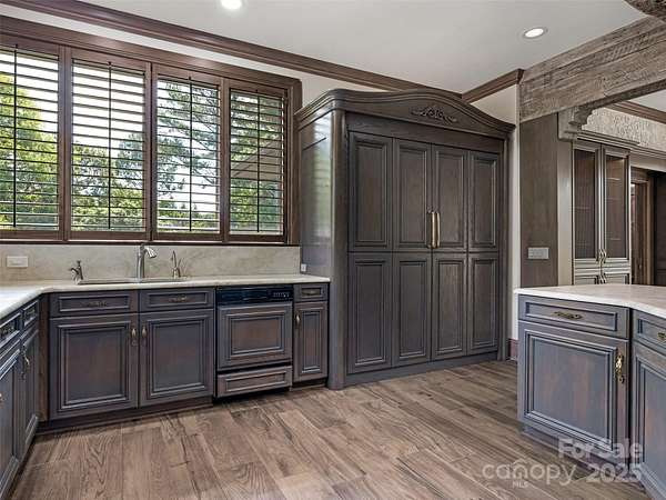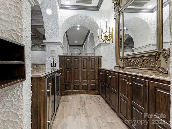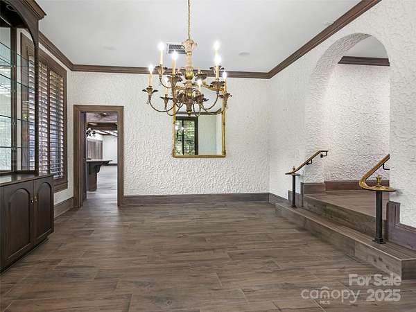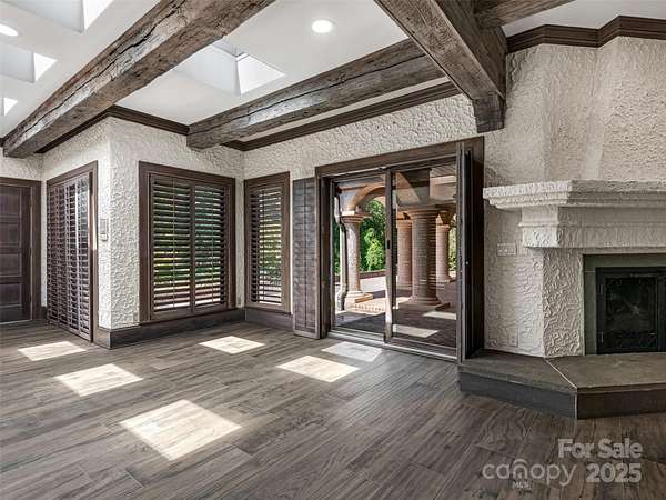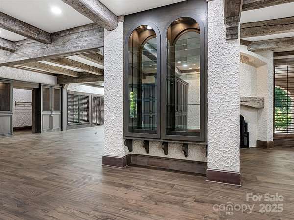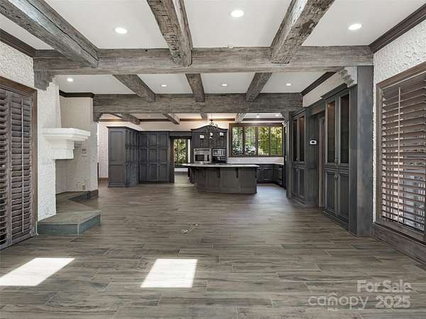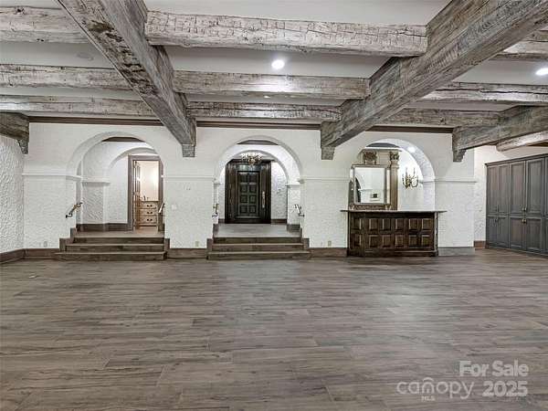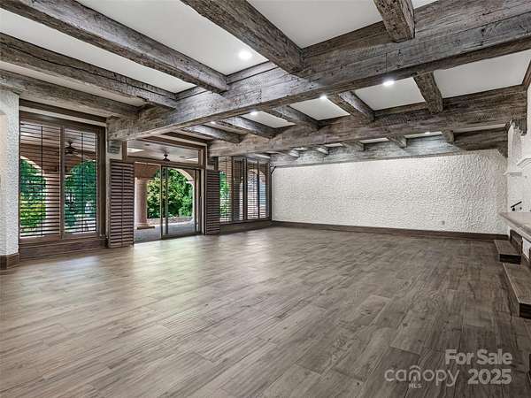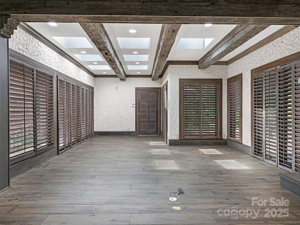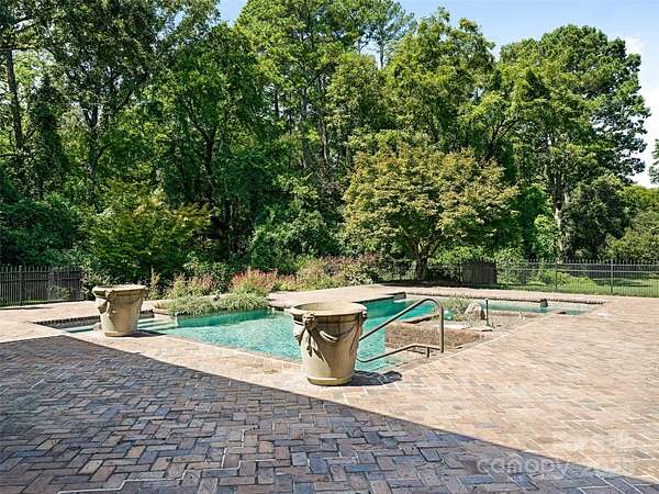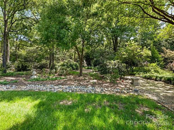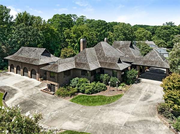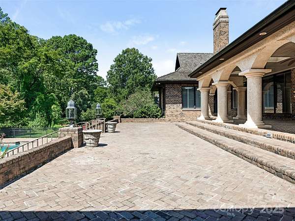Exceptional Estate on Private Road - Welcome to this remarkable all-brick, 1-story estate offering nearly 6,000 sq. ft. of heated living space in one of South Charlotte's most sought-after neighborhoods. Tucked away on a private road near Quail Hollow and Carmel Country Clubs, this residence blends timeless craftsmanship with modern comfort. Enter inside to high ceilings and stunning antique hand-hewn beams that anchor the main living spaces with warmth and character. The home boasts four bedrooms, four full baths and three half baths, along with abundant storage including a 1,200+ sq. ft. walk-up attic complete with a cedar closet. Multiple fireplaces create inviting gathering spaces plus, a dramatic wet bar in living room. Designed for both entertaining and everyday living, the floor plan flows seamlessly outdoors to expansive patios (with a 1/2 bath for the pool), a covered terrace and a sparkling pool-perfect for hosting or relaxing in privacy. A porte-cochere and four-car garage (with over 1,700sq ft) provide convenience and curb appeal. There is also a garage storage room and garage storage loft. Cedar shake roof and copper gutters compliment the exterior. This rare opportunity combines architectural detail, spacious design and a premier location-a true sanctuary just minutes from world-class golf, dining and shopping.