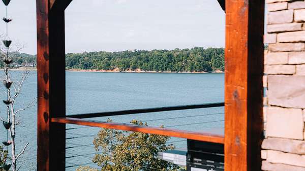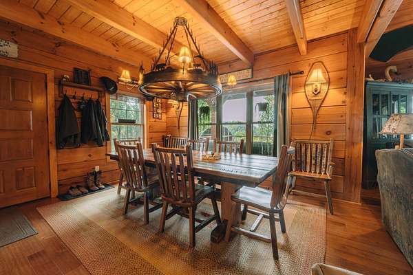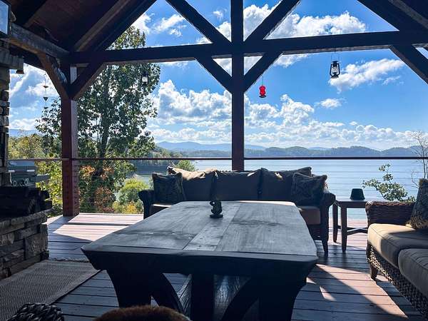 This exquisite 3-bed, 5-bath timber frame log cabin offers unparalleled luxury and breathtaking views of the Smoky Mountains. Designed for those who crave sophistication, tranquility, and world-class entertaining, this dockable waterfront retreat is a masterpiece of craftsmanship and modern amenities, enhanced by extensive recent upgrades. Step inside to a warm, open-concept interior with soaring ceilings and expansive windows showcasing stunning main channel lake views. The entire home has been freshly stained, highlighting its timeless log cabin charm. The gourmet kitchen, now featuring a brand-new GE Cafe Range and custom cabinetry, flows seamlessly into the spacious living area. Each of the three generously sized bedrooms features en-suite bathrooms, with the master suite boasting a newly installed large slider for seamless lake views, an improved luxurious shower, and a fully renovated master closet. The lower level is an entertainer's paradise, boasting an unbelievable custom basement designed for unforgettable gatherings. At its heart is a massive, professionally crafted bar area, complete with ample seating, sleek countertops, and space for hosting lively parties and events. This extraordinary basement also includes a state-of-the-art movie theater with newly upgraded theater equipment, perfect for immersive movie nights or game-day watch parties. New air conditioners have been installed for both the top and bottom levels, providing comfort in every season. Step outside to the expansive back porch and lower deck, now featuring new porch posts and railings, where you can unwind while soaking in panoramic lake and mountain views. The meticulously improved landscaping,complete with a charming waterwheel and serene pond, enhances the beauty and privacy of the grounds. A newly added expansive boat dock provides direct access to Douglas Lake for boating, fishing, or enjoying the water, while a new roof on the home ensures lasting durability.