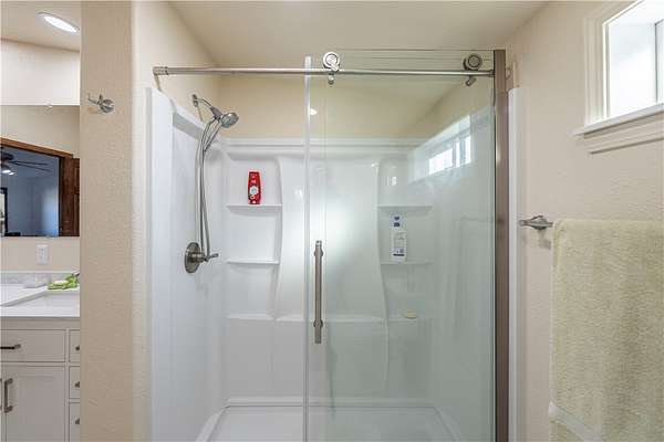 - Dining Area, Kitchen Island, Laminate Counters, Laminate Countertop, Primary Suite, Programmable Thermostat, Separate Shower, Shower Only, Vaulted Ceilings, Walk In Closets, Window Treatments