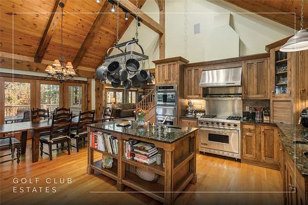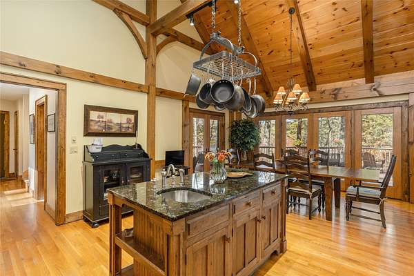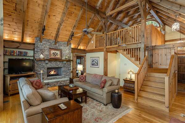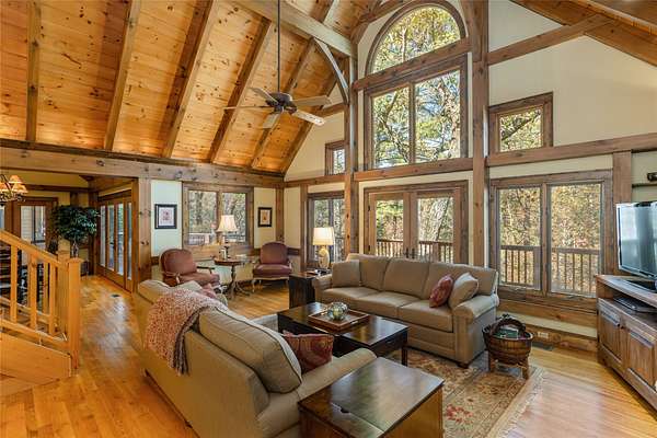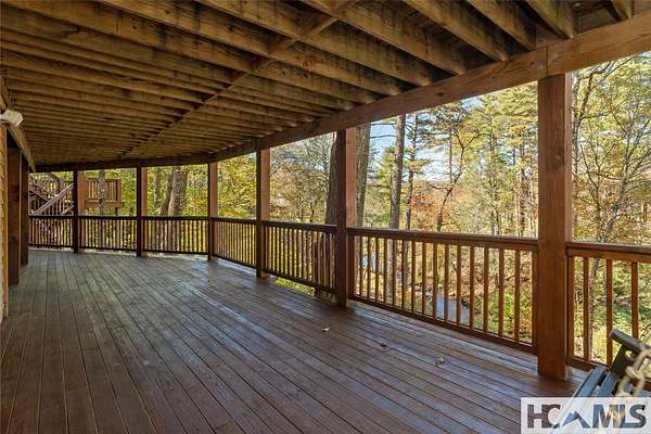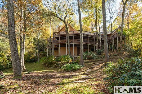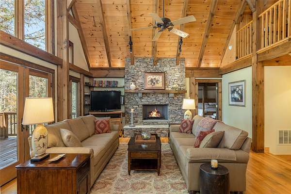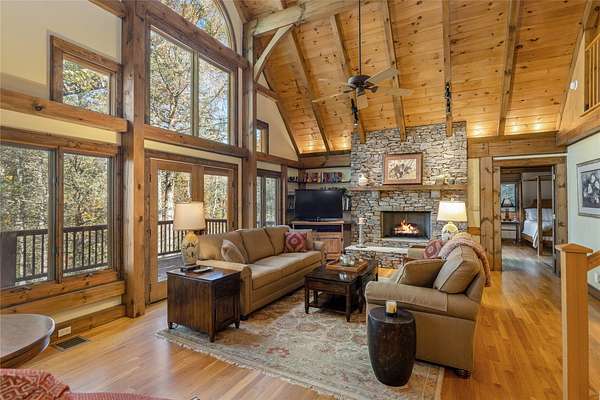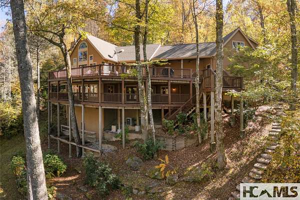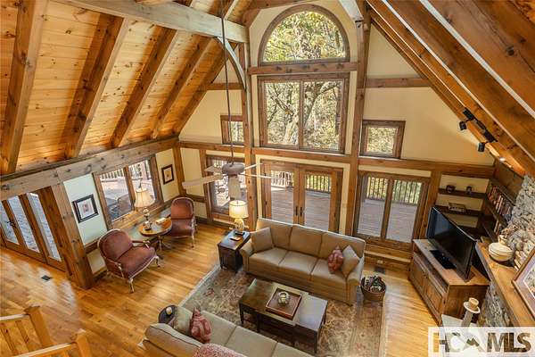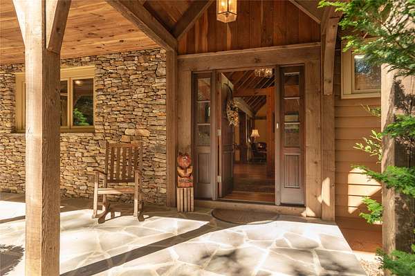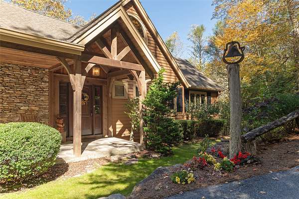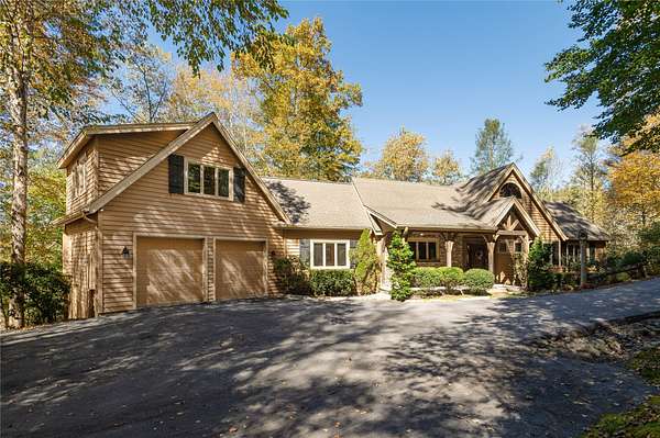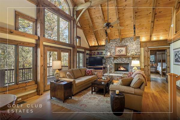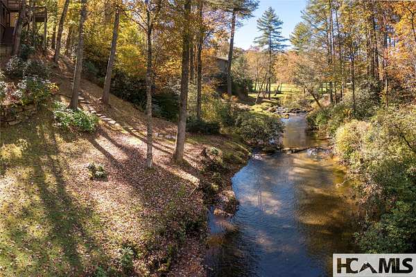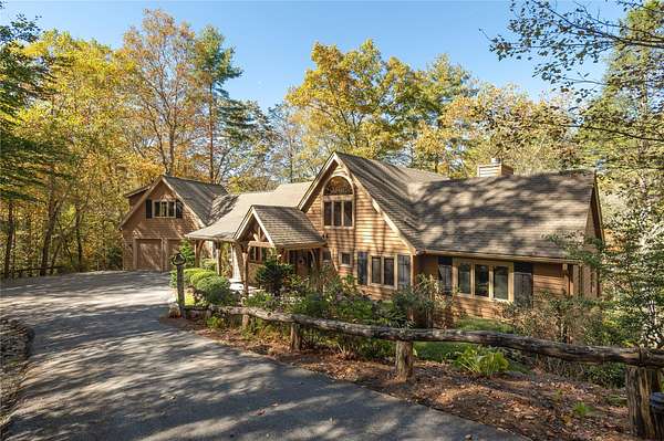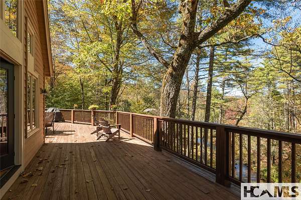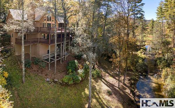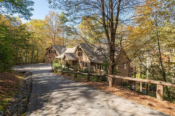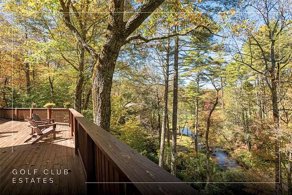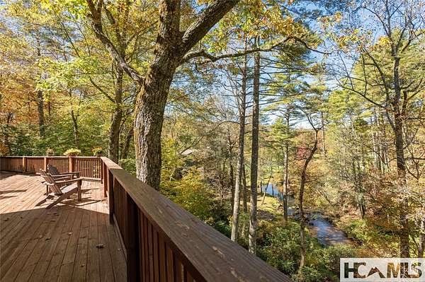 Set along the banks of the Horsepasture River, this exceptional mountain residence captures the essence of refined living on the Highlands-Cashiers Plateau. The gentle rhythm of rushing water becomes a constant companion, creating a setting that is both peaceful and invigorating. As the sun rises, soft morning light settles over the river and the surrounding landscape. By evening, the same vantage point transforms into a warm, layered backdrop of mountain silhouettes and fading light. Beyond the river, the fourth hole of the golf course comes into view, framed by distant ridgelines that complete this remarkable setting. Designed in a timeless post-and-beam style, the home exudes warmth and authenticity. Rich wood tones and natural textures create an inviting atmosphere throughout, blending mountain character with enduring craftsmanship. Many of the home's principal rooms open directly onto expansive decks or overlook the river, allowing the sights and sounds of the water to be experienced from nearly every vantage point. The main level is thoughtfully arranged to provide effortless living, with primary spaces designed for both comfort and connection. Wake each morning to the sound of the river and unwind in the evening with views that feel both intimate and expansive. An upper-level bedroom offers a quiet retreat, ideal for reading, reflection, or a private workspace. The lower level is designed for hosting, with a spacious family room that separates two well-appointed guest suites, each with access to the outdoor deck and surrounding landscape. Above the garage, a generously sized bonus room provides additional flexibility and privacy, perfect for guests or a secluded studio. Located just minutes from the centers of Cashiers and Sapphire, and a short golf cart ride to the Country Club of Sapphire Valley (membership by invitation only), this property offers both convenience and seclusion. This is a rare opportunity to own a private retreat where the beauty of the Horsepasture River and the timeless appeal of mountain living come together in perfect balance.