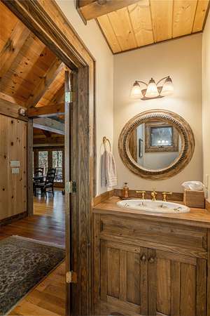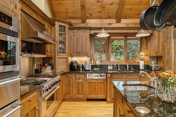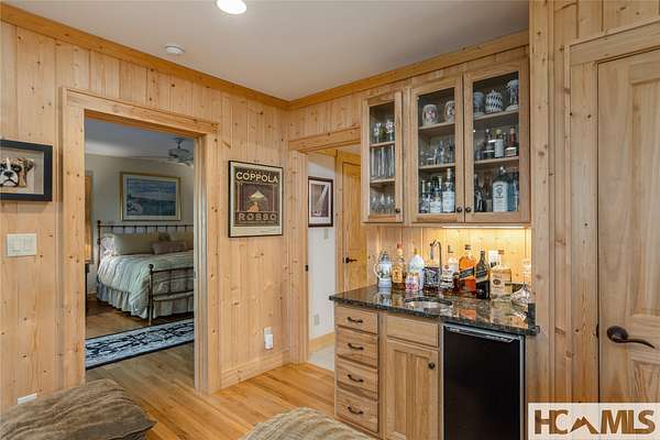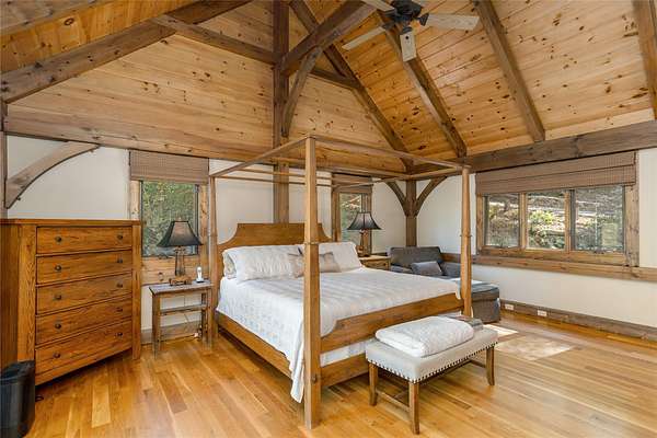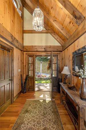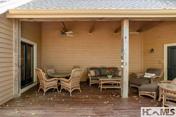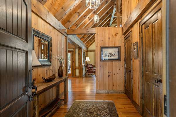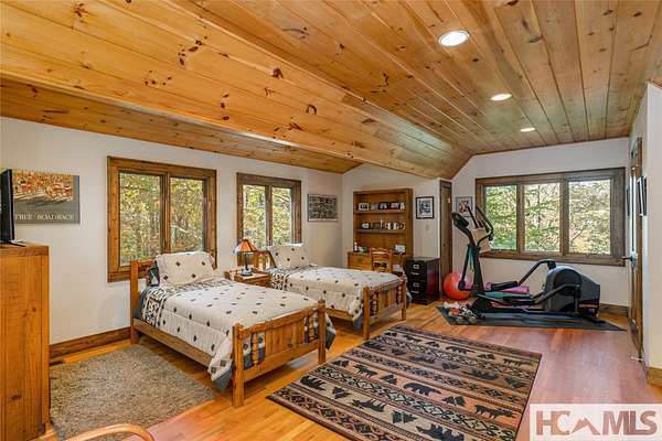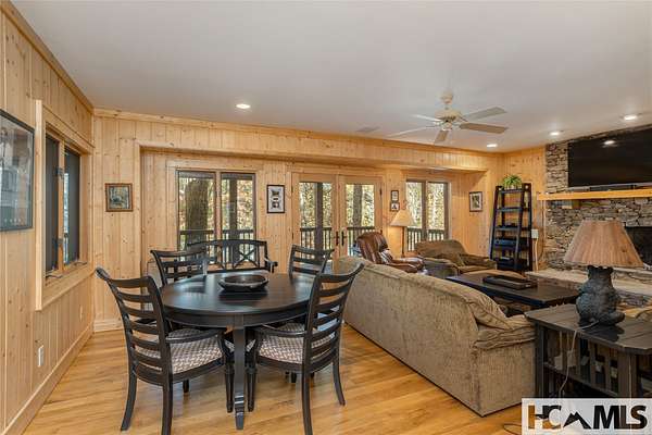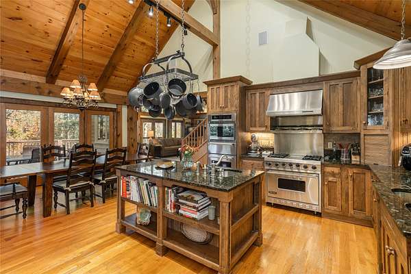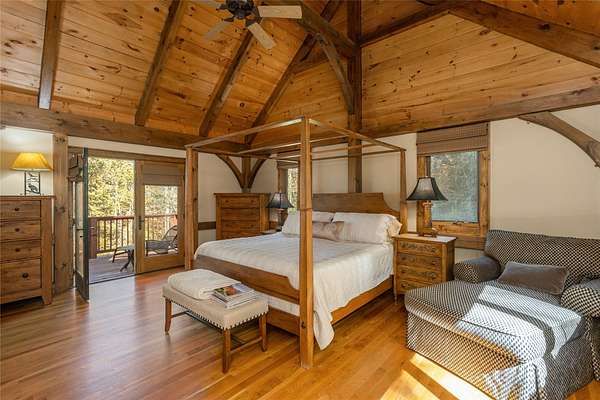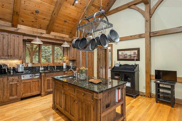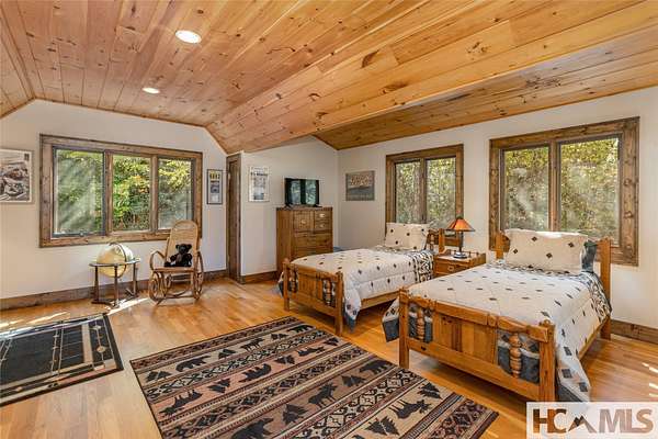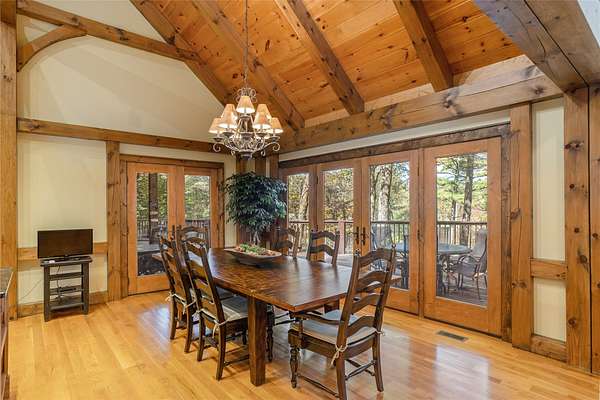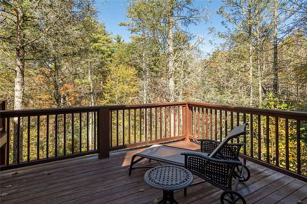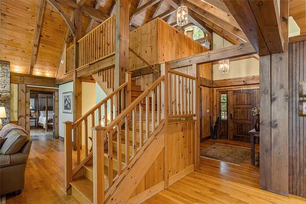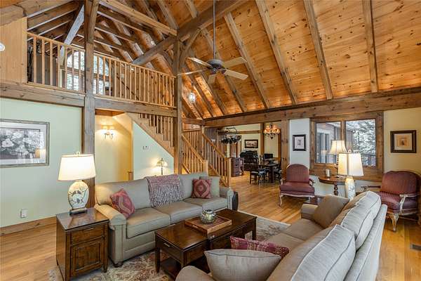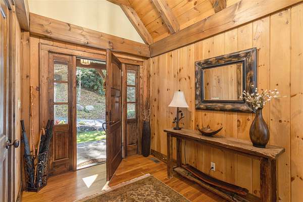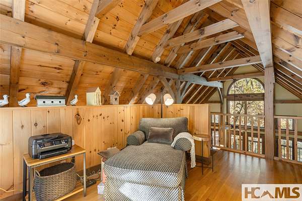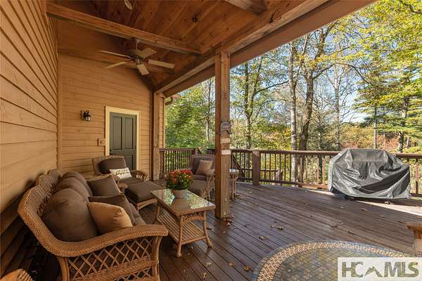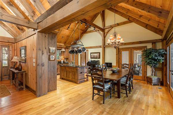 Set along the banks of the Horsepasture River, this exceptional mountain residence captures the essence of refined living on the Highlands-Cashiers Plateau. The gentle rhythm of rushing water becomes a constant companion, creating a setting that is both peaceful and invigorating. As the sun rises, soft morning light settles over the river and the surrounding landscape. By evening, the same vantage point transforms into a warm, layered backdrop of mountain silhouettes and fading light. Beyond the river, the fourth hole of the golf course comes into view, framed by distant ridgelines that complete this remarkable setting. Designed in a timeless post-and-beam style, the home exudes warmth and authenticity. Rich wood tones and natural textures create an inviting atmosphere throughout, blending mountain character with enduring craftsmanship. Many of the home's principal rooms open directly onto expansive decks or overlook the river, allowing the sights and sounds of the water to be experienced from nearly every vantage point. The main level is thoughtfully arranged to provide effortless living, with primary spaces designed for both comfort and connection. Wake each morning to the sound of the river and unwind in the evening with views that feel both intimate and expansive. An upper-level bedroom offers a quiet retreat, ideal for reading, reflection, or a private workspace. The lower level is designed for hosting, with a spacious family room that separates two well-appointed guest suites, each with access to the outdoor deck and surrounding landscape. Above the garage, a generously sized bonus room provides additional flexibility and privacy, perfect for guests or a secluded studio. Located just minutes from the centers of Cashiers and Sapphire, and a short golf cart ride to the Country Club of Sapphire Valley (membership by invitation only), this property offers both convenience and seclusion. This is a rare opportunity to own a private retreat where the beauty of the Horsepasture River and the timeless appeal of mountain living come together in perfect balance.