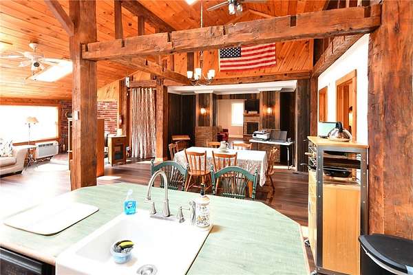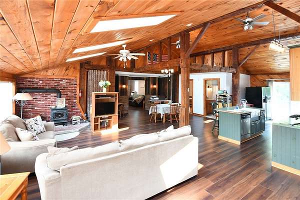 Come take a look at this spacious 2 story home on a corner lot of 3.1 acres in the town of York (hamlet of Fowlerville). This home has a substantial great room with open floor plan - kitchen/dining area/family room. This sizable room features tongue & groove knotty pine on some walls as well as covering the entire ceiling which is vaulted with exposed supporting beams. Flooded with light from the bank of windows on one side, sliding glass doors opposite and numerous skylights. Also has wood burning fireplace with brick surround and multiple ceiling fans. Separate living room has gas fireplace and radiant heating in the floor. Primary bedroom is on the first floor with private bathroom and walk in closet. Laundry room with utility sink is just off kitchen. Home has studio apartment which has a private access as well as entry from the main home. Recently completed entire remodel of this area. Fantastic space for use as in-law apartment or rental. Second level has 3 bedrooms, 1 full bathroom, room used as storage and has mini splits for heat/air conditioning. One car attached garage, current usage for lawn mover & landscape equipment. Also has a detached two car garage. Public water and natural gas. All offers to be accompanied with pre-approval letter or proof of funds letter. All offer to be written on GRAR forms.