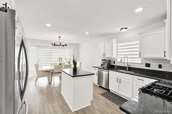 Stunning updated split-level home offering 4 bedrooms, including a first-floor primary suite, and an open floor plan. A welcoming entry leads directly into a large great/family room with vaulted ceilings, an upper-level overlook, and abundant natural light, showcasing a beautiful staircase with hardwood steps.