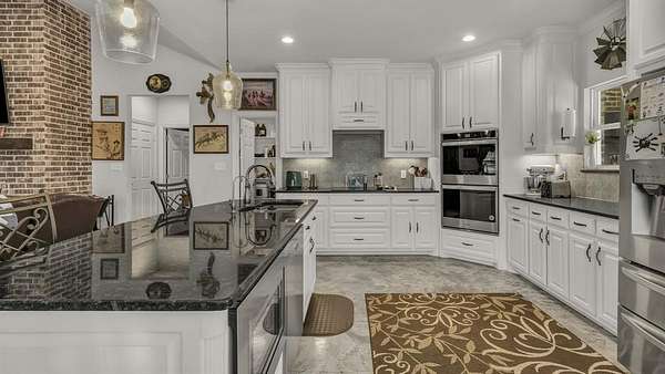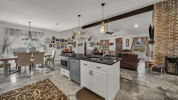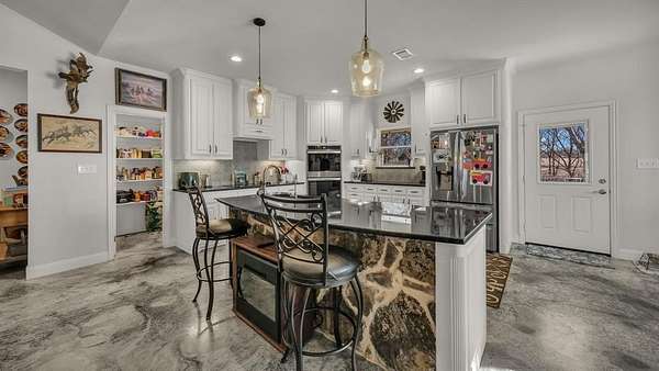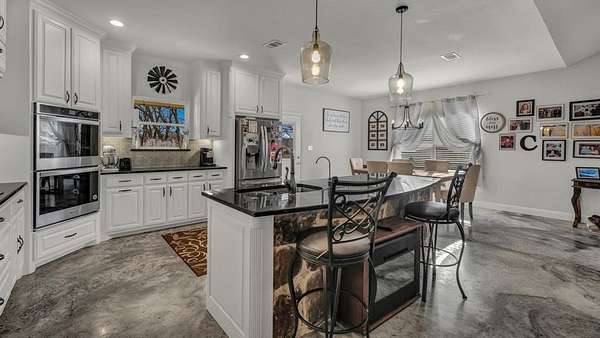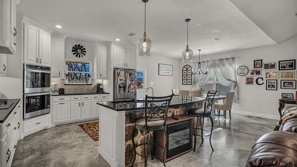 Inside, the open-concept layout flows effortlessly with stained concrete floors, soaring ceilings, and a warm living room centered around a wood-burning fireplace. The kitchen is designed for gathering featuring a large island, granite countertops, double ovens, and abundant cabinetry, perfect for everyday living and entertaining alike.
