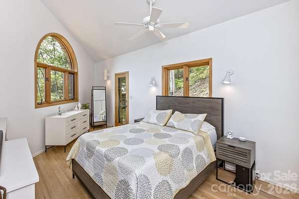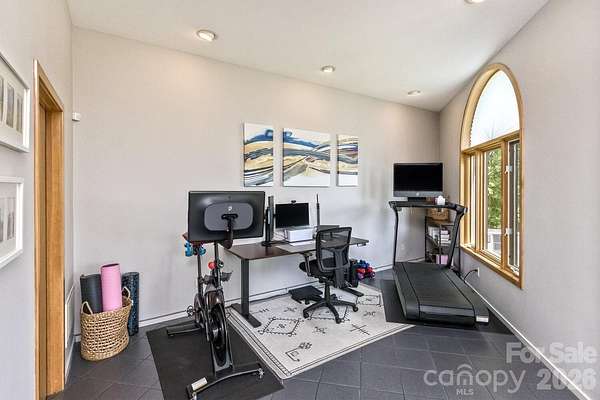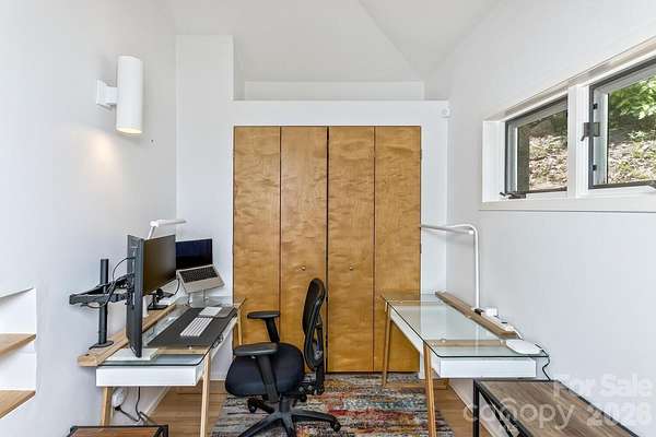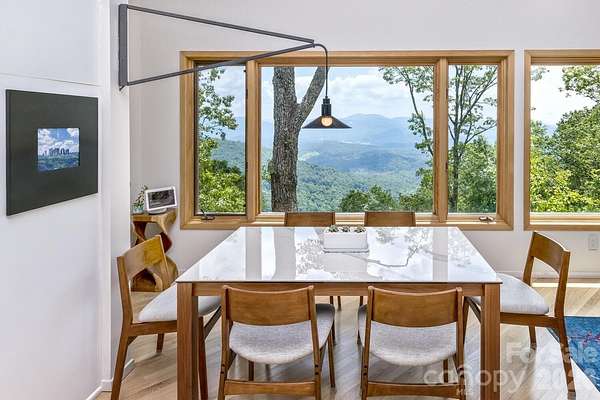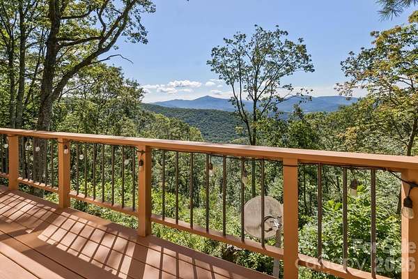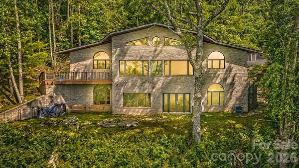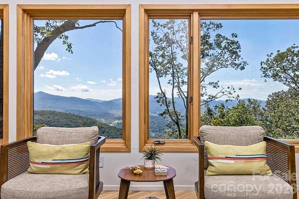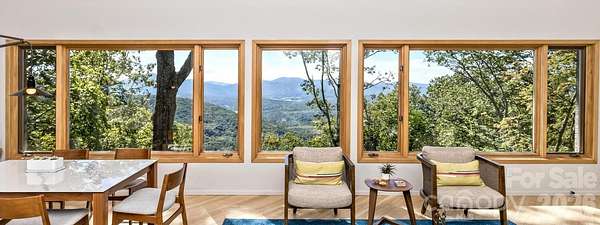 Perched high above the surrounding landscape and tucked into more than 8 private acres, this one-of-a-kind modern mountain retreat offers a rare combination of architecturally bold design, energy efficiency, and breathtaking natural beauty. Designed with a striking triangular footprint, the home is thoughtfully positioned to capture panoramic, layered views of the Blue Ridge Mountains from nearly every angle-creating a constantly changing backdrop of light, color, and season for your life. Surrounded by mature hardwoods, mountain laurel, and rhododendron, the setting feels completely secluded, with no visible neighbors and a true sense of escape. A gated driveway reinforces the property's privacy making it ideal as a serene full-time residence or lock-and-leave getaway. Inside, the home features an open floor plan, cathedral ceilings for natural light, and a dramatically designed geometry. Expansive windows draw the outdoors in, framing long-range mountain vistas and filling the space with morning sunlight, while afternoon shade from the surrounding trees keeps the home naturally cool. Built with efficiency and sustainability in mind, this passive solar home was built to offer lower utility costs. Features include a Tulikivi soapstone thermal wood stove, energy-efficient gas fireplace, HRV ventilation system, and multiple heating options that blend comfort with performance. Whole house generator. The main level supports one-level living, while a finished walk-out basement provides flexible space for guests, multi-generational options, and recreation. Thoughtful details such as built-ins, a Murphy bed, hardwood and tile flooring, and a modern kitchen with quality finishes further elevate the home's livability. Outdoor living is just as compelling. The deck and viewing vistas take in the unobstructed, long-range mountain views-often described as "above the clouds." The Fairview Forest acreage itself has a "remote sanctuary" feel, with hiking trails, natural beauty, wildlife protection, with well-maintained roads for your safer winter access. Located just 24 minutes from Pack Square downtown Asheville. Easy access to Blue Ridge Parkway, Black Mountain, and I-40, this property delivers the rare balance of complete privacy with convenience for dining, culture, and outdoor adventure. A truly distinctive home-architecturally bold, environmentally thoughtful, and immersed in nature. HOA is