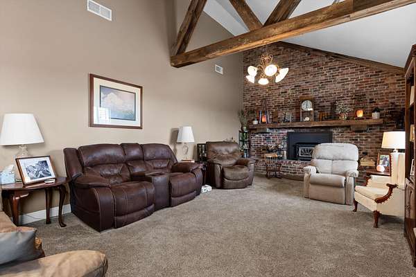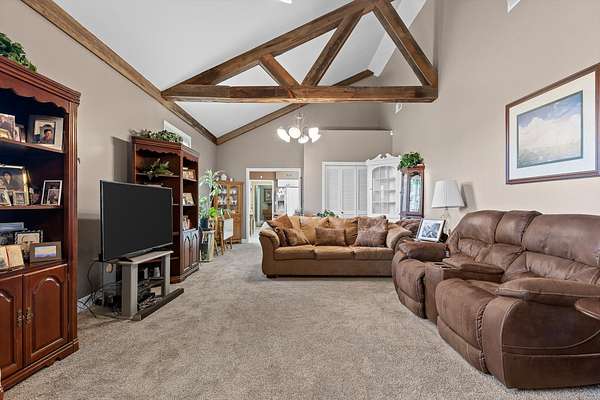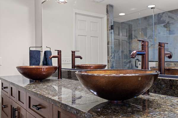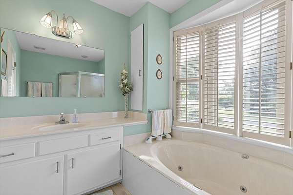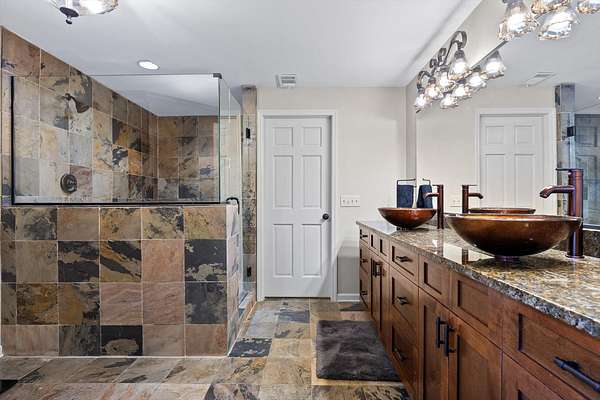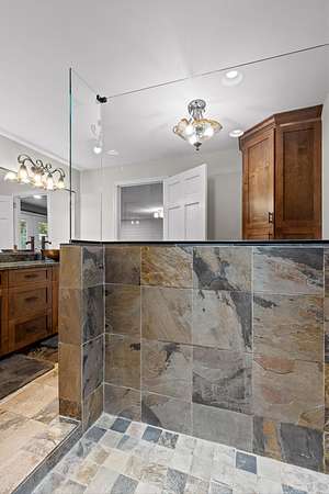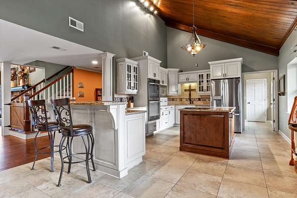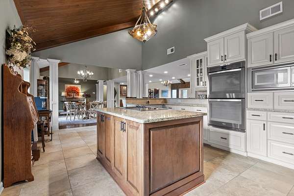 - Built-In Features, Cathedral Ceiling(s), Ceiling Fan(s), Connected Shared Bathroom, Double Vanity, Eat-In Kitchen, Granite Counters, High Ceilings, Kitchen Island, Open Floorplan, Pantry, Primary Downstairs, Separate Dining Room, Tub/Shower Combo, Walk-In Closet(s)