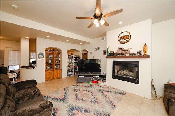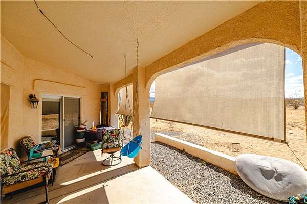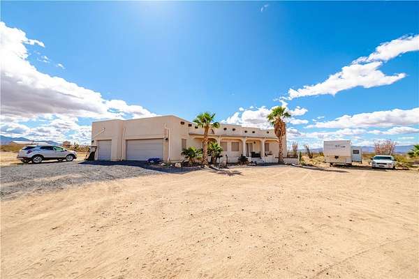 A Desert Oasis Charm! This amazing Santa Fe home sits on just under 10 acres with 3 bedrooms, 2 1/2 bath and with a 3 car garage. This custom built home has over 2100 square feet of living space, open floor plan, 2 dining room areas (both casual and formal) . This home offers 9 and 10 foot ceilings , large living/family areas. The Primary bathroom has a tub and a walk in shower with dual sinks. Two separate heating and AC units (less than 2 years old) for both sides of the house along with a swamp cooler for the garage. Take in the panoramic views from your covered back porch with the acreage and the privacy along with the pop-up pool in the back. Property has its own well (low yield) BUT has good yield with a Shared Well agreement. Property is only 6 miles from I 40 and only 40 minutes from Kingman and Lake Havasu! Enjoy the lake for all your fishing and water activities. Please use directions below - do not use GPS!