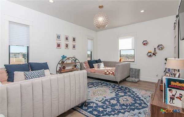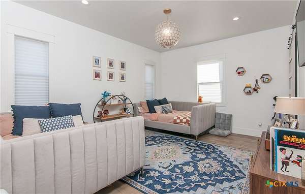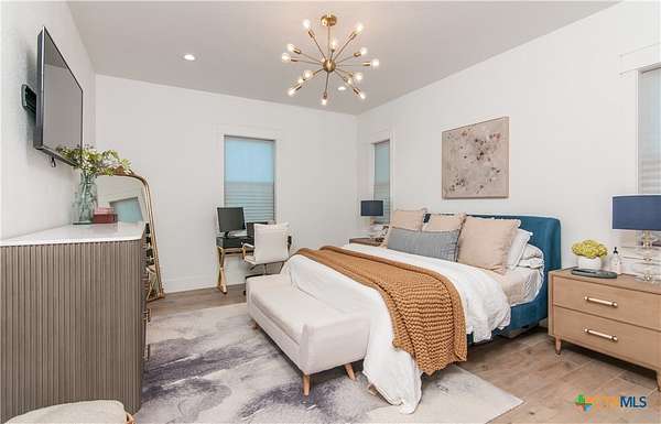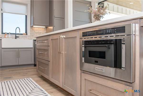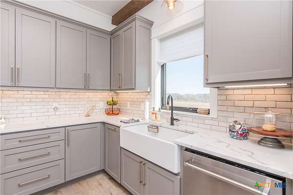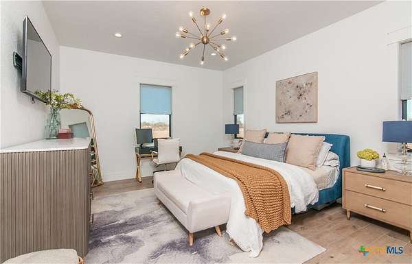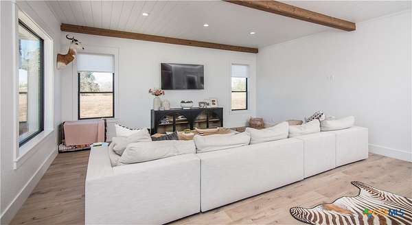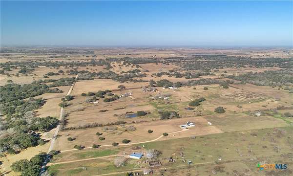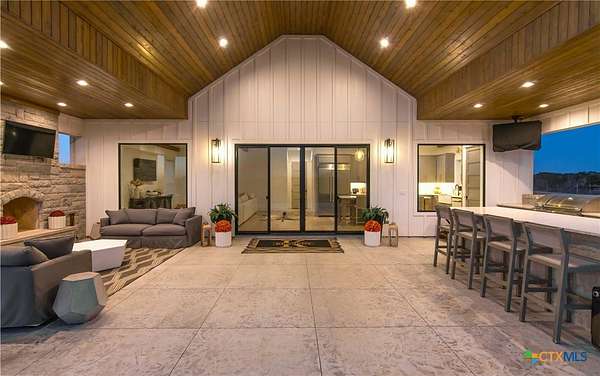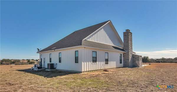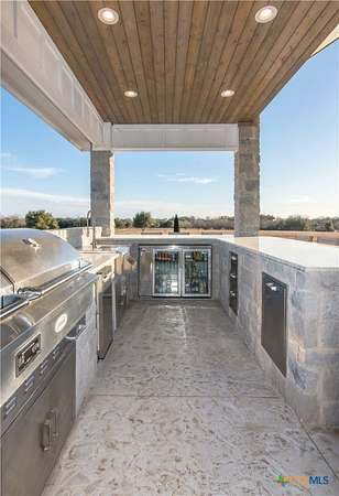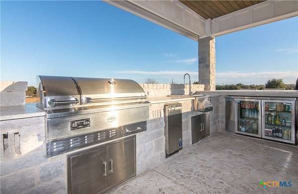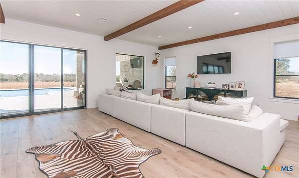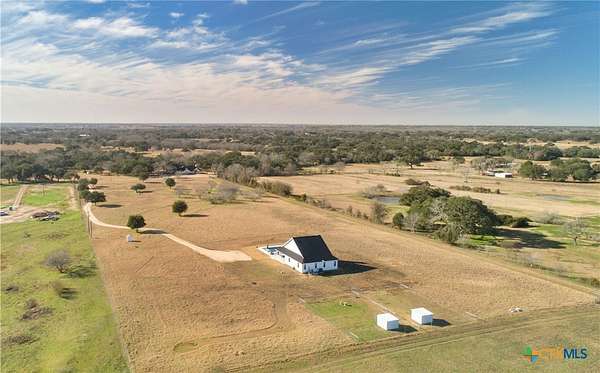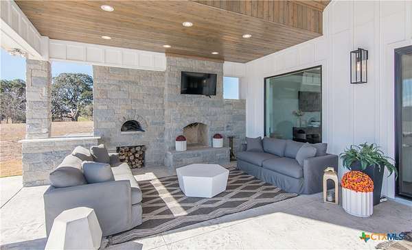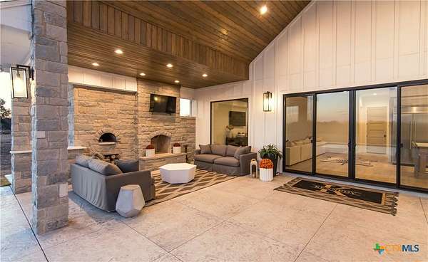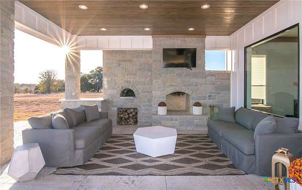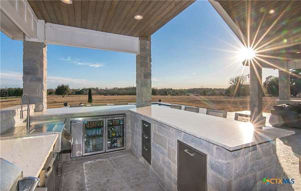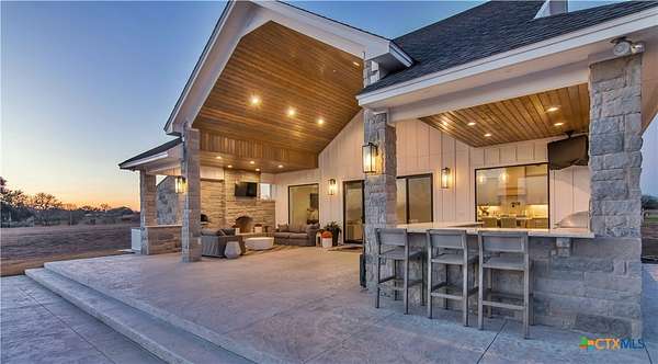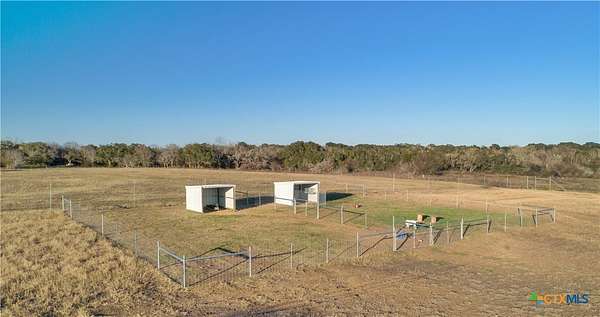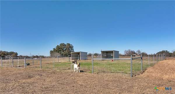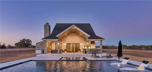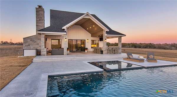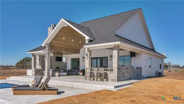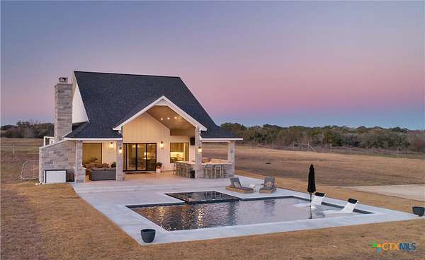 This property offers a 2-bedroom, 1-bath home built in 2022, located in the small community of Yoakum, centrally situated between Houston, Austin, San Antonio, and Corpus Christi. Set on 10 acres with a gated entrance and high fencing, it features a large covered patio with an outdoor kitchen, a Louisiana pellet grill, a True fridge/cooler, an outdoor sink, and an ice maker. The home boasts a Zline gas range, an oversized stainless steel fridge, tile flooring, a large kitchen island, and an open-concept layout. Additional amenities include 4-H pens for small animals, an outdoor fireplace with a pizza oven, a chlorine pool with a hot tub and tanning shelf, a water softener, pot filler, large windows offering views of the property and pool, a tiled indoor shower, and an outdoor shower. The exterior combines stone and Hardiplank, with cedar beadboard on the patio ceiling. This property is an ideal weekend getaway, perfect for entertaining with its spacious indoor and outdoor features.
