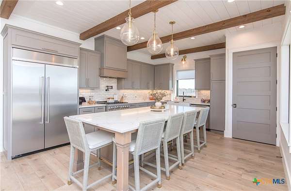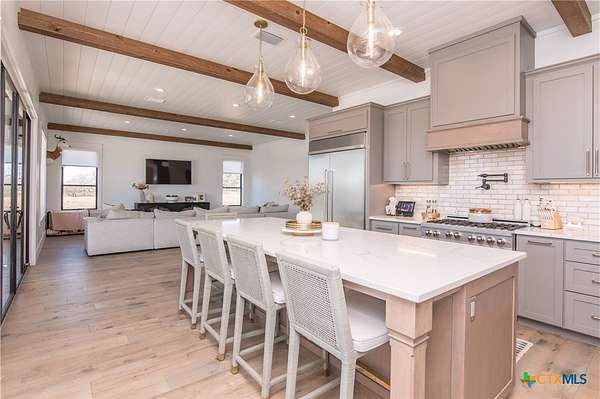 - Beamed Ceilings, Breakfast Bar, Eat In Kitchen, Kitchen Dining Combo, Kitchen Family Room Combo, Kitchen Island, Open Floorplan, Pantry, Pot Filler, Solid Surface Counters