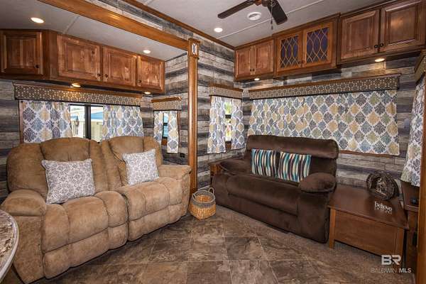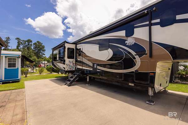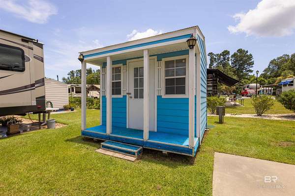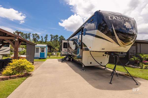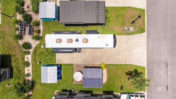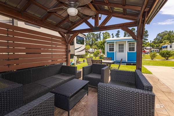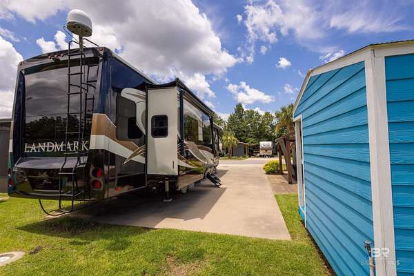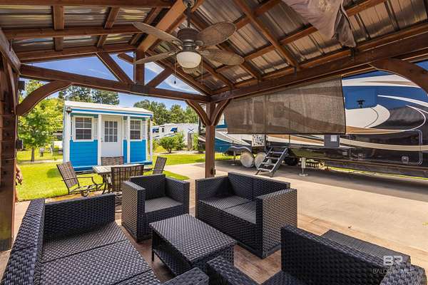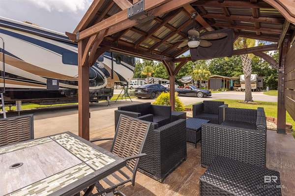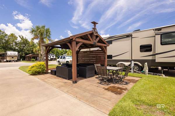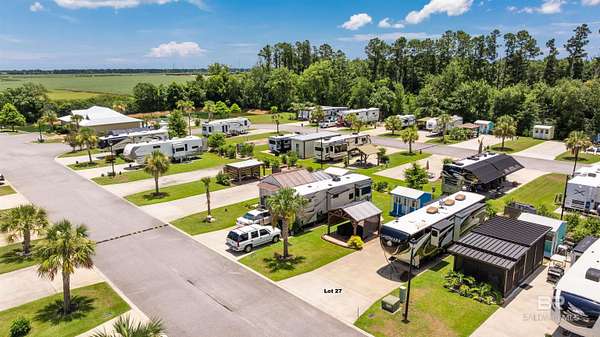 Lot 27 in Creekside RV Resort is located just off County Road 20 in Foley, Alabama - conveniently situated between Hwy 59 and the Foley Beach Express. This central location places you minutes from OWA, Tropic Falls Water Park, Foley Sports Complex, Tanger Outlets, and the white-sand beaches of Gulf Shores and Orange Beach.Measures approximately 80' by 40', with a concrete slab RV pad - 20' x 60', offering generous space for large Class A, B, or C motorhomes or fifth wheels. Attached to pad - stamped concrete patio with gazebo on it. Beneath the gazebo is a complete outdoor living setup featuring a mounted TV, ceiling fan, table with chairs, a love seat, two armchairs, and a coffee and side tables - ideal for relaxing or hosting guests in comfort and shade. A freestanding storage building on-site offers additional convenience for storing outdoor gear or supplies. Currently operated as a vacation rental, the lot is featured on rvfoley. com with nightly rates for just a lot - $65. The seller is offering the on-site fifth wheel - a 2018 Landmark - for an additional $55,000. The current rate for this improved lot with RV in place runs between $175-250 a night - its a turnkey opportunity for both personal enjoyment and rental income. Creekside RV Resort features a welcoming atmosphere with monthly HOA dues of $180, which cover lawn maintenance, sprinkler service, trash pickup, Wi-Fi, and cable TV. Resort amenities include a heated pool, stocked fishing pond, clubhouse, bathhouses, laundry facilities, a dog park, and a fenced playground. Buyer to verify all details during due diligence. Buyer to verify all information during due diligence.