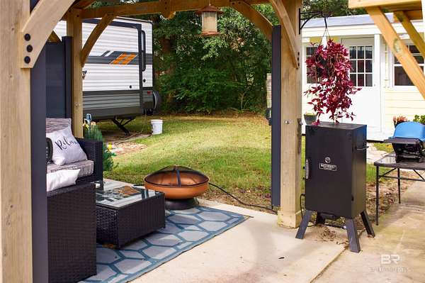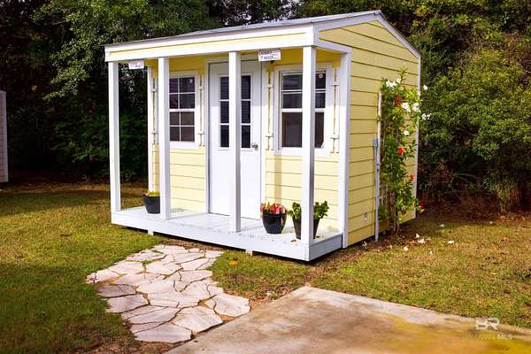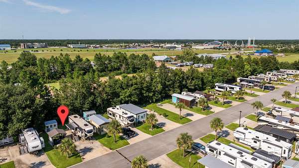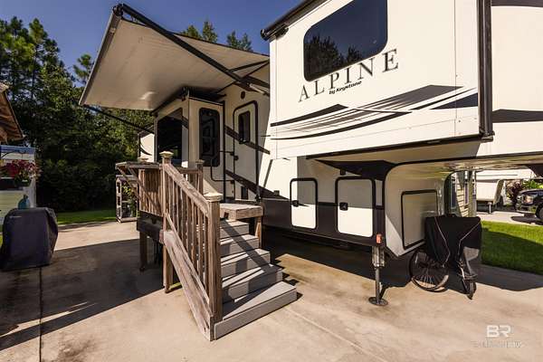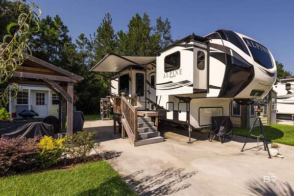 Lot 14 in Creekside RV Resort is a 40' x 80' deeded RV lot positioned along the outer edge of the community with a wooded backdrop for added privacy. The property includes a 20' x 60' concrete RV pad with full hookups for water, sewer, and electricity, plus an additional 8' x 16' concrete pad with a covered gazebo. The gazebo is outfitted with outdoor furniture, solar lights, a ceiling fan, wood and gas fire pits, and an electric smoker, creating a comfortable outdoor living area. A utility building is in place with a water heater, full-size washer and dryer, chest freezer, and shelving. A paved walkway connects the utility building to the RV pad, custom-built stairs lead to the camper, and the landscaping includes a peach tree, palms and other planters. Owners allowed to manage short-term rentals themselves through platforms such as Airbnb or VRBO or using park's rental management company. The seller is also offering the 2019 Keystone Alpine fifth wheel currently on site (approximately 43') for an additional $42,000, providing a true turn-key option for personal use or vacation rental income. Creekside RV Resort is a quiet, pet-friendly community of 61 individually owned lots. The HOA fee of $180 per month covers lawn service, sprinkler system, trash pickup, Wi-Fi, and cable. Community amenities include a heated pool, stocked fishing pond with fountain and fishing deck, clubhouse, laundry facilities with coin machines, bathhouses and showers, a pavilion, fenced playground and dog park. The resort sits across from the Foley Sports Complex and is minutes from OWA, Tropic Falls Indoor/Outdoor Water Park, Tanger Outlets, shopping, dining, and entertainment. The white-sand beaches of Gulf Shores and Orange Beach are about 11 miles away, with Graham Creek Nature Preserve and Gulf State Park nearby for kayaking, hiking, biking, and wildlife viewing. Buyer to verify all information during due diligence.