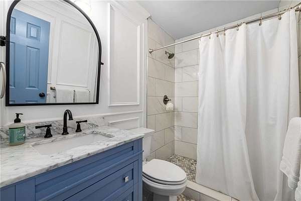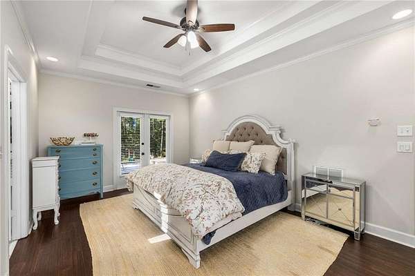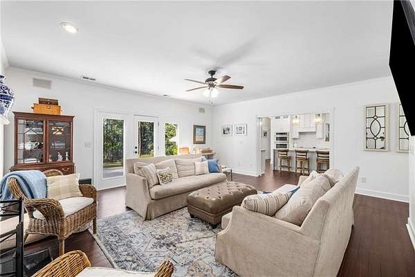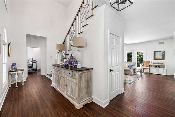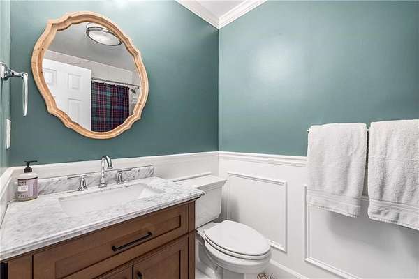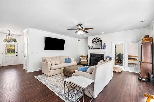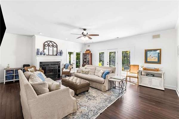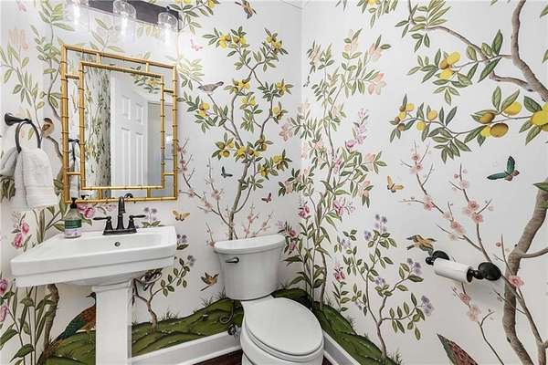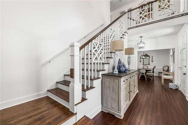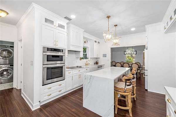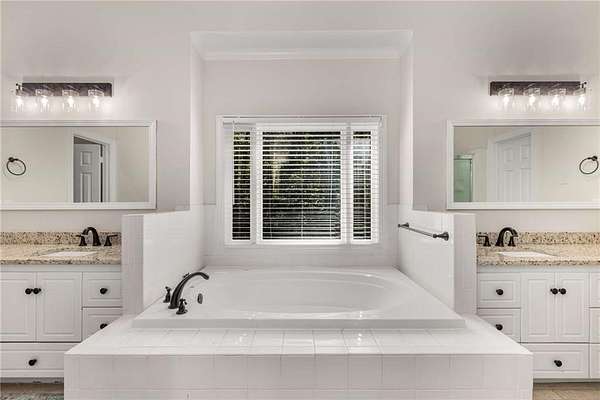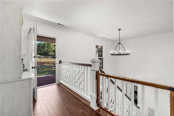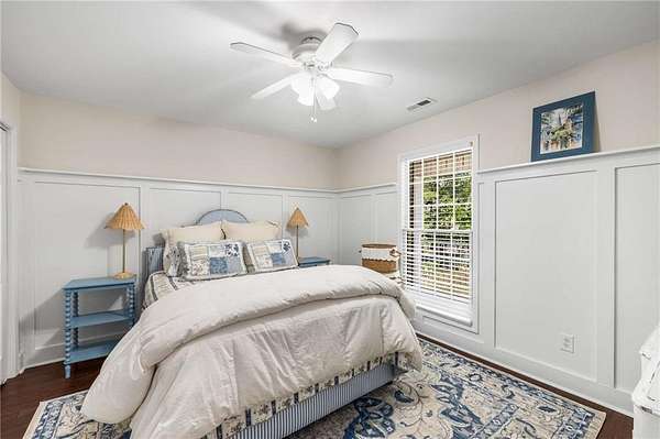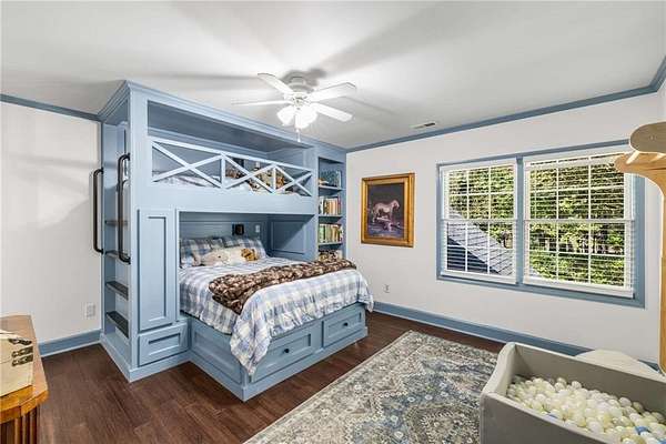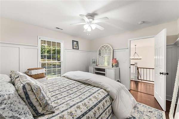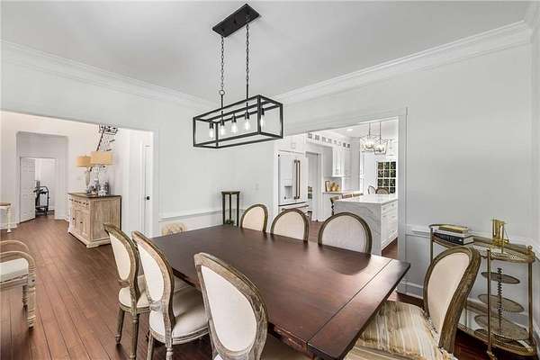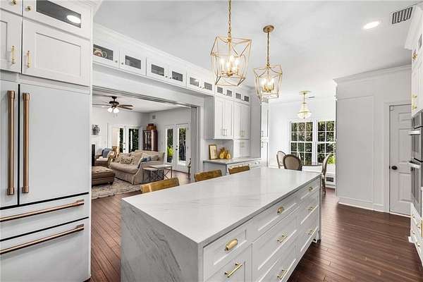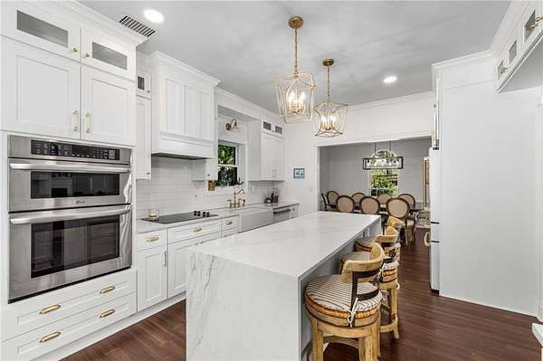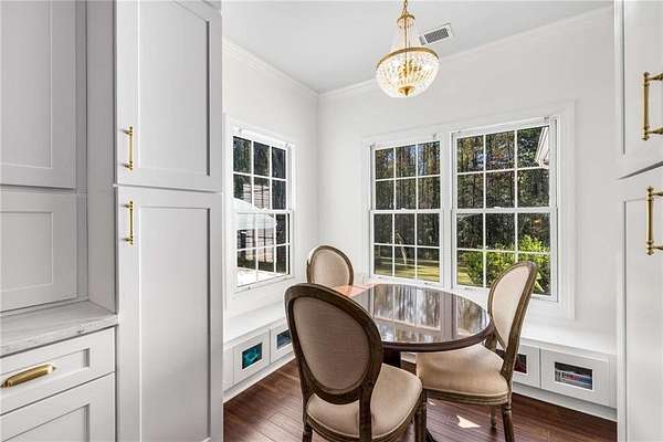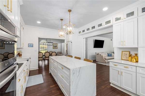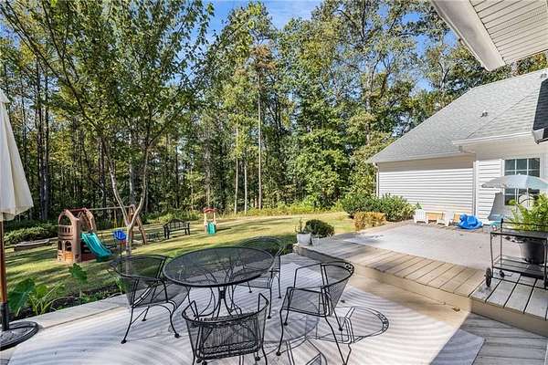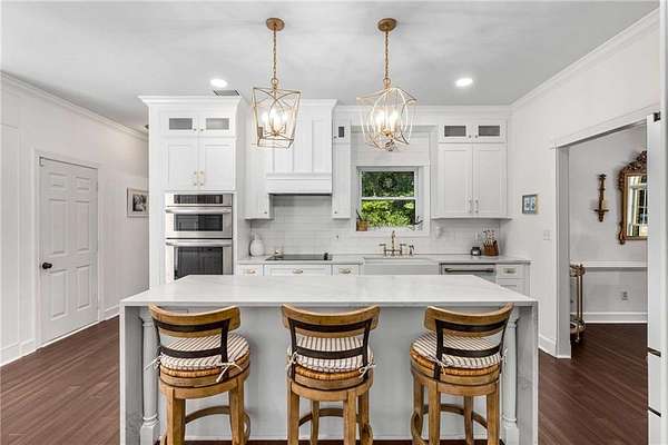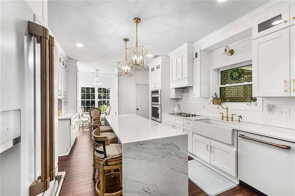 Privately tucked on 4.6 serene, wooded acres, this timeless three-sides brick Colonial blends privacy with polished sophistication and lives like a bespoke estate. A top-to-bottom refresh delivers a truly move-in-ready experience: dark bamboo wood flooring throughout the entire home sets a warm, contemporary tone; a custom-designed staircase railing anchors the entry; and every space has been thoughtfully elevated for daily comfort and effortless entertaining. The completely reimagined kitchen showcases an improved layout with widened openings to the dining and living rooms, including pocket doors for flexible flow. Culinary details impress, cooktop relocated to the back wall with exterior venting, custom cabinetry topped with quartz counters, tile backsplash, and a larger waterfall-edge island with seating. A farmhouse sink with Kingston Brass faucet and a charming breakfast nook with built-in bench complete this magazine-worthy space. Just off the main living areas, the renovated laundry room is both chic and practical--new tile, custom cabinets, quartz countertops with single-slab quartz backsplash, a stainless utility sink, deep enough for dog baths, new faucet, and a built-in dog kennel neatly tucked beneath the cabinetry. The primary suite on the main remains a serene retreat with beautifully refinished cabinetry, granite countertops, soaking tub, dual vanities, and two walk-in closets. Upstairs, smart planning created two full baths where there was once one: a new hall bath with shower/tub combo, fresh tile floors and walls, decorative trim, new vanity and fixtures; and a new private en-suite for the bedroom suite, featuring a stand-up shower, coordinated tile, decorative millwork, vanity, fixtures, and toilet. Secondary bedrooms are generous, and a custom built-in bunk, Twin over Queen, with bookshelf adds function and fun for guests or kids. French doors from the fireside family room open to a large, beautiful deck overlooking a sun-splashed, more open backyard. With coveted zoning for Dowell ES, Smitha MS, and Osborne HS, this residence pairs rare acreage and a quiet setting with curated finishes and modern systems--a luxury escape in the heart of Marietta.