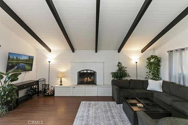 Upon entry, the home opens to a grand vaulted great room with bright white ceilings accented by striking exposed beams, a statement fireplace, and expansive sliding glass doors providing access to multiple patios. The layout offers thoughtful bedroom separation with one bedroom to the left and three bedrooms to the right.