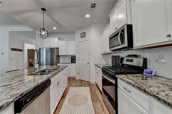Welcome Home! This beautiful property is nestled in a highy desirable neighborhood in Monroe. The Glen Cove community provides wide open space, it's a Great location to call home. This 4 bedroom, 3 bath home is situated on a cul-de-sac lot on 2 Acres, no neighbors behind you! One-level living provides for the ultimate comfort - high ceilings and a large brick fireplace set the tone for the family room that overlooks a covered back porch and a private backyard. Kitchen is stunning with a large island, Whirlpool Stainless Steel appliances, Delta Kitchen Faucet, Granite Countertops, White Cabinets with a separate dining area. You'll enjoy the sanctuary of your Primary suite with it's functionality and abundant space. Main en-Suite features a larger than most Retreat style Spa Shower, double vanity, and large walk-in closet, with 3 additional bedrooms. Exterior features include brick water table and shake accents. This lot connects to Williamson Lake, the owners love to kayak, just a short walk from their own lot. The homeowners are in the process of relocating out of state.