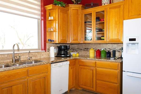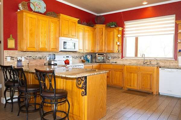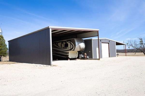 Nestled on just over 5 beautifully manicured acres dotted with trees and a tank, this stunning 3-bedroom, could be 4 or more bedrooms, home offers everything you've ever dreamed of in peaceful country living. Step inside to a spacious open-concept layout featuring expansive living, dining, and kitchen areas adorned with gorgeous wood-look tile throughout. The living room showcases a unique fireplace design complemented by a stylish wet bar with sink. The kitchen is truly the heart of the home, boasting an enormous wraparound granite countertop, abundant cabinetry, and a massive walk-in pantry. The split primary suite offers privacy and comfort, complete with a luxurious spa-like bathroom featuring a separate walk-in shower, soaking tub, and an oversized walk-in closet. Outside, the property continues to impress with a massive workshop featuring an overhead door for easy drive-in access. There's also a large covered RV parking area equipped with electricity and water, plus an additional covered parking space ideal for vehicles, boats, or recreational equipment. This exceptional property combines comfort, functionality, and serene country charm, a true oasis you won't want to miss.