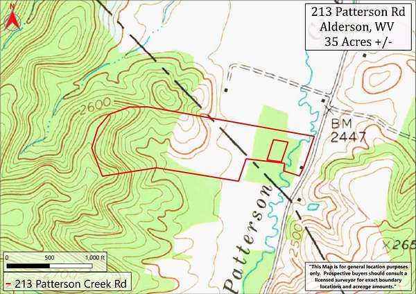 From the Dawson exit, turn right onto Lawn Rd. Continue for 1.9 miles and turn left onto Grassy Meadows Rd. After 1.5 miles, turn right onto Patterson Creek Rd (Co Rte 27/2). The destination, 213 Patterson Creek Rd, will be on the left after about 0.6 miles.