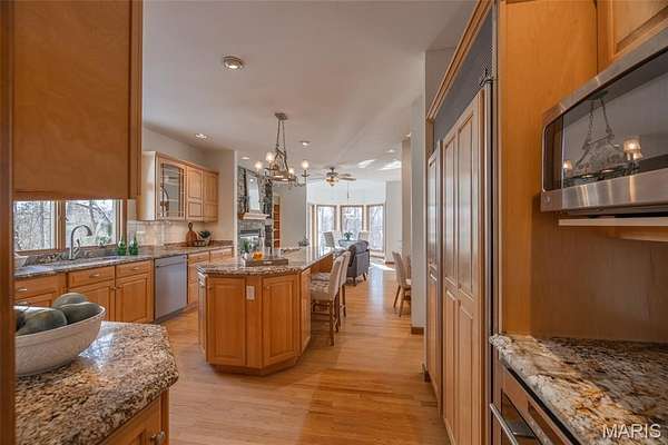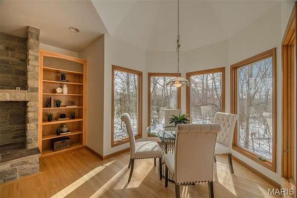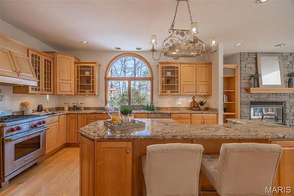 Step inside and be immediately captivated by the dramatic wall of windows and 12-foot ceilings that illuminate the large great room and showcase the surrounding natural beauty. A private dining room sits just off the main living area, ideal for intimate dinners or entertaining. The gourmet chef's kitchen features custom cabinetry, a premium WOLF convection steam oven, Sub-Zero refrigerator, and a spacious Butler's pantry. Adjacent to the kitchen is a beautiful hearth room with a gorgeous stone fireplace, creating a warm and inviting gathering space. Just off the hearth room is a perfect breakfast nook, surrounded by views of the wooded landscape. Enjoy morning coffee on the expansive deck area.