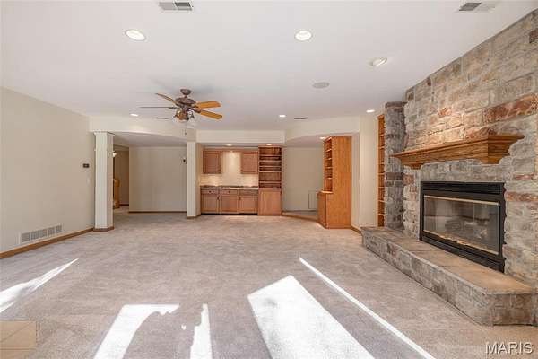The main-level primary suite is a luxurious retreat with a large walk-in closet and a spa-inspired bathroom complete with a soaking Jacuzzi tub. The lower level expands the living space with three generous bedrooms, a second stone fireplace, and an open recreation area ideal for games, gatherings, and relaxation. French doors lead to the aggregate patio, perfect for outdoor dining and peaceful evenings surrounded by nature.