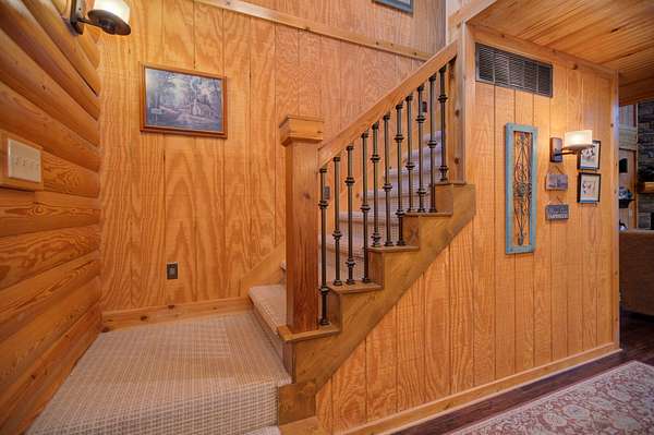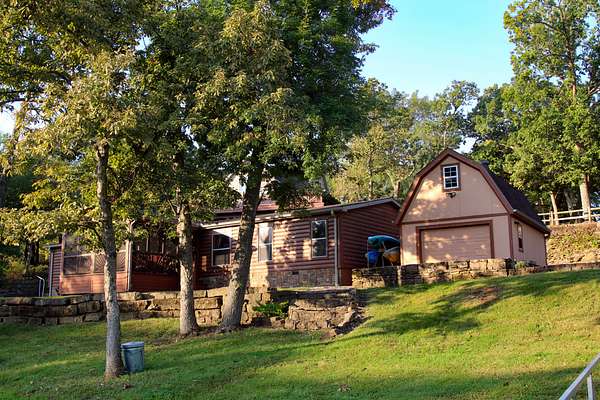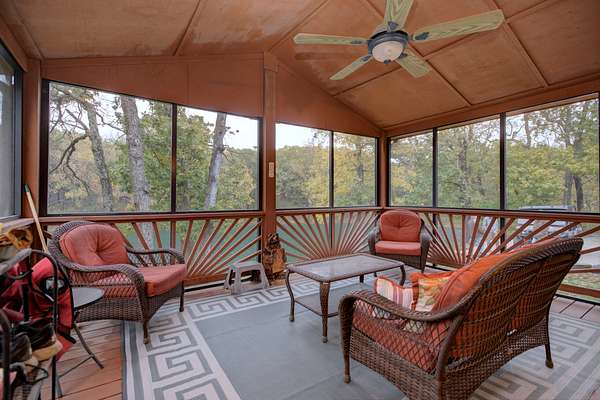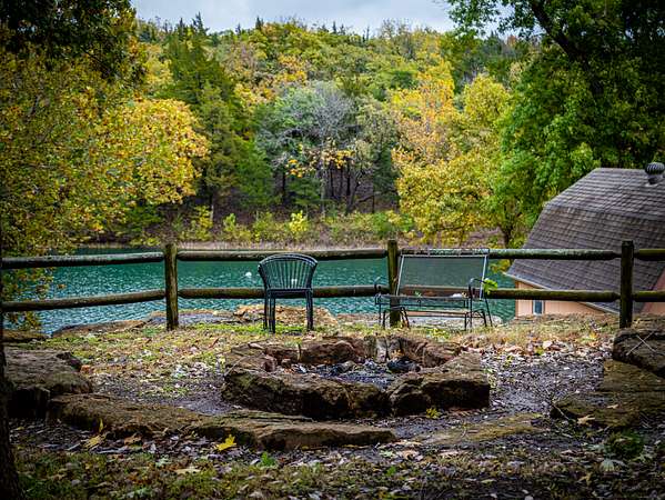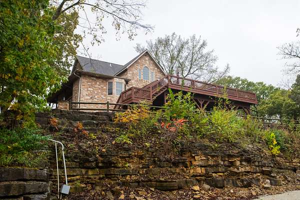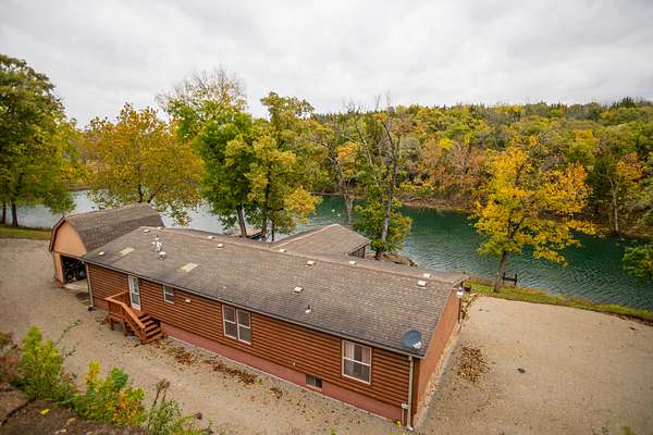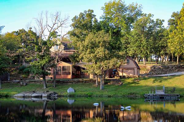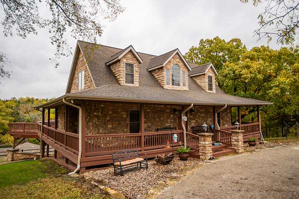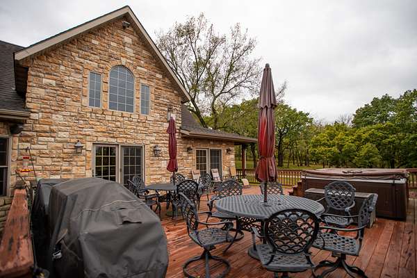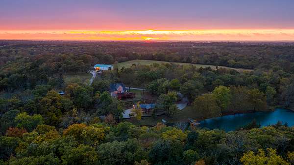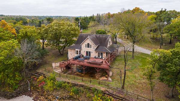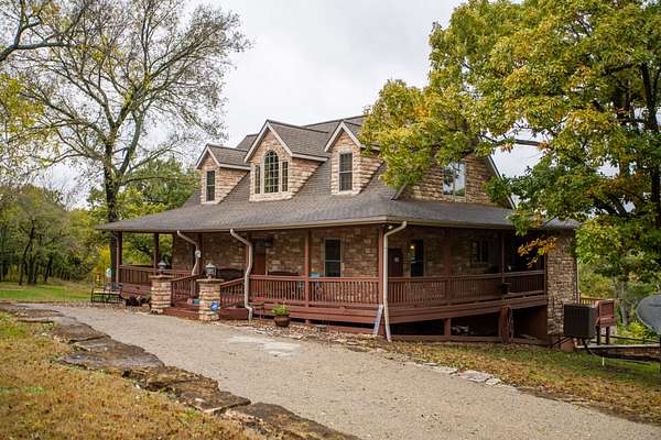 The main home, built in 2006, is a stunning 3,287+- square-foot residence that perfectly blends rustic Kansas character with modern comfort. Set on a gentle rise overlooking the pond, it captures the spirit of a true country lodge while offering the quality and craftsmanship of a custom build. From the moment you step onto the wrap-around porch, the attention to detail is evident--natural wood finishes, stone accents, and wide-open views that stretch across the water and timbered hillsides.