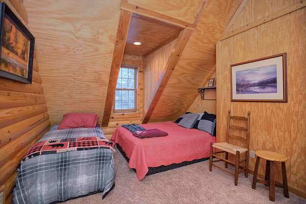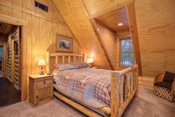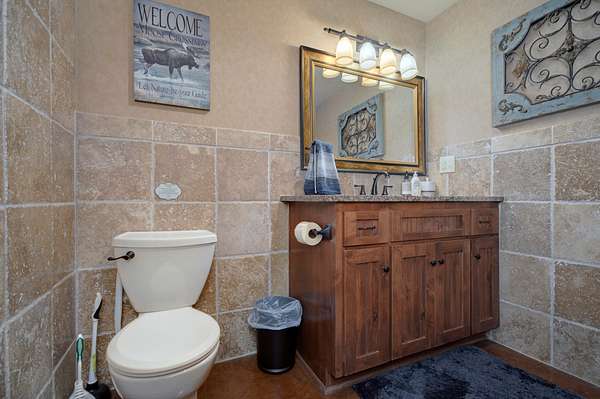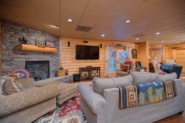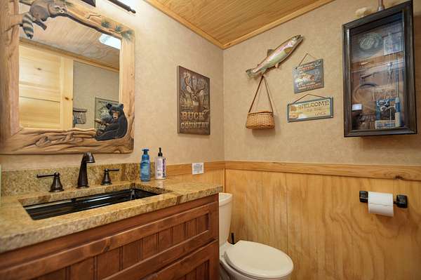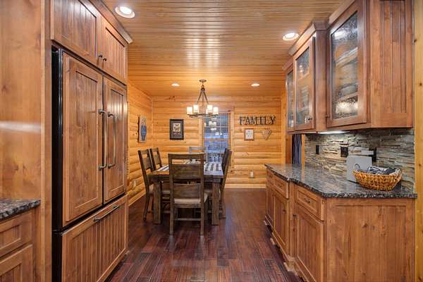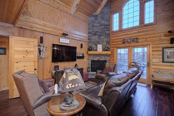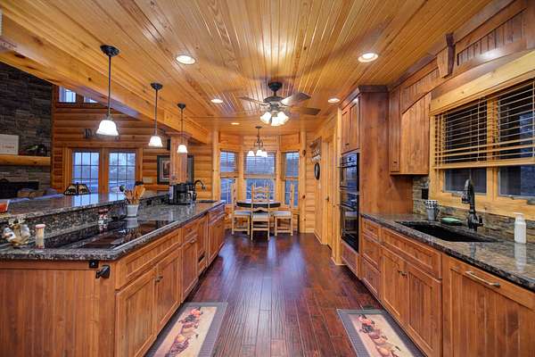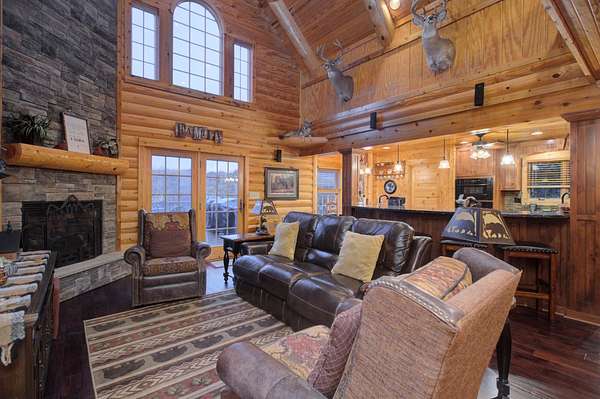 Inside, the home features three bedrooms and three and a half bathrooms, highlighted by warm wood floors, granite countertops, and a vaulted timber-beam ceiling that gives the great room an inviting, open feel. The large kitchen island serves as the centerpiece of the main living area, designed for gatherings after long days on the land. Two gas fireplaces add warmth and ambiance, framed by custom wood and stonework that reflect the home's rustic elegance.