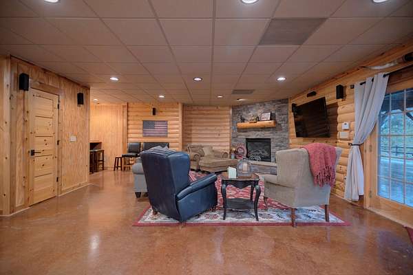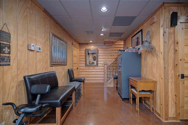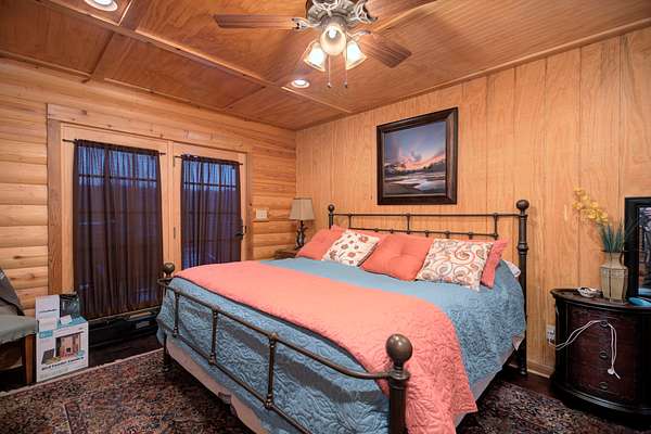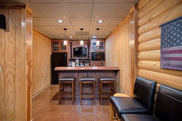 The walk-out basement continues the same level of craftsmanship, with heated concrete floors, a wet bar with refrigerator, and a spacious open area perfect for entertaining or hosting family. Large windows and patio doors lead out to a covered porch creating a seamless indoor-outdoor flow that takes full advantage of the property's serene views. Upstairs, a lofted deck extends from the main living area, offering a panoramic overlook of the pond--an ideal spot for morning coffee, while watching the sun rise from the east.