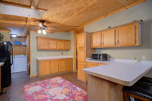The guest home, built in 1996, offers 1,716+- square feet of comfortable living space with three bedrooms and two bathrooms, providing an ideal retreat for family, friends, or hunting guests. Designed with a warm rustic feel, the home features oak kitchen cabinetry, wood accents throughout, and a striking custom interior stone accent wall that adds character and charm. The open-concept floor plan creates an inviting atmosphere, while the primary bedroom includes a private en suite bath for added convenience. A screened-in porch overlooks the pond, offering a peaceful place to unwind and enjoy the view. The guest house has its own water meter, septic tank, and 500-gallon propane tank, ensuring complete independence from the main residence. A small storage building nearby provides space for tools, outdoor gear, or equipment. Thoughtfully designed and well-maintained, this guest home complements the main lodge perfectly--offering privacy, comfort, and a true sense of place in the Kansas countryside.